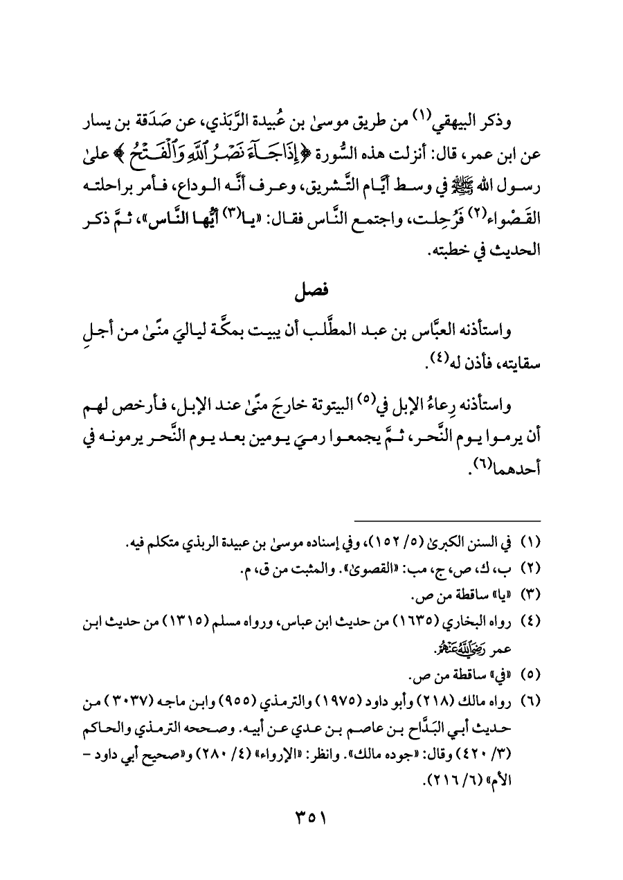 واستأذنه العبَّاس بن عبد المطَّلب أن يبيت بمكَّة لياليَ منًى من أجلِ سقايته، فأذن له (¬٤).