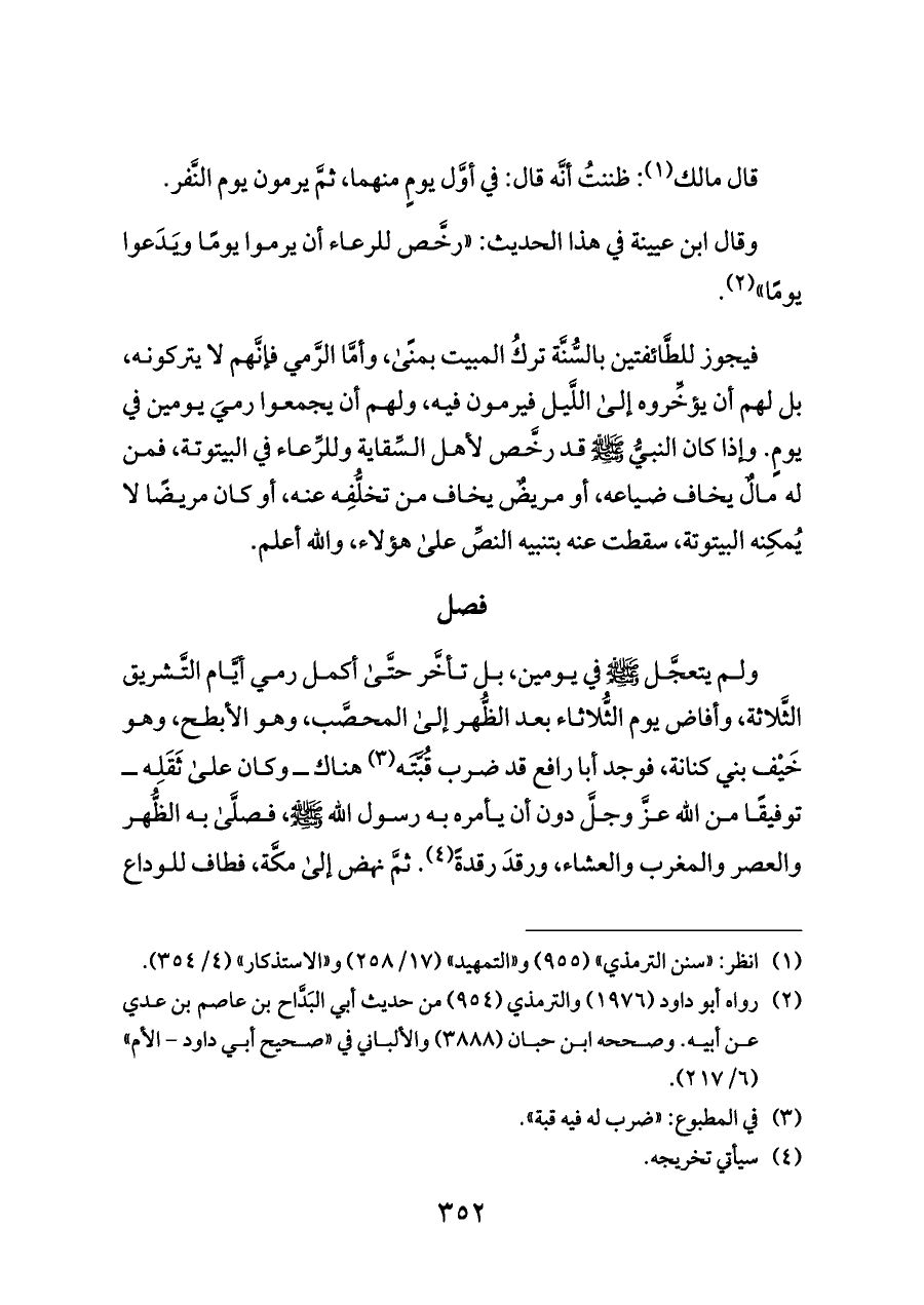 فيجوز للطَّائفتين بالسُّنَّة تركُ المبيت بمنًى، وأمَّا الرَّمي فإنَّهم لا يتركونه، بل لهم أن يؤخِّروه إلى اللَّيل فيرمون فيه، ولهم أن يجمعوا رميَ يومين في يومٍ. وإذا كان النبيُّ - صلى الله عليه وسلم - قد رخَّص لأهل السِّقاية وللرِّعاء في البيتوتة، فمن له مالٌ يخاف ضياعه، أو مريضٌ يخاف من تخلُّفِه عنه، أو كان مريضًا لا يُمكِنه البيتوتة، سقطت عنه بتنبيه النصِّ على هؤلاء، والله أعلم.