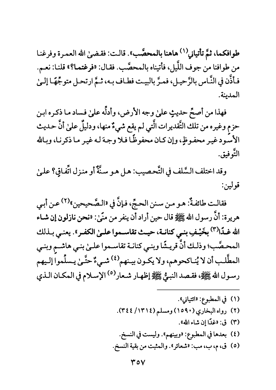فقالت طائفةٌ: هو من سنن الحجِّ، فإنَّ في «الصَّحيحين» (¬٢) عن أبي هريرة: أنَّ رسول الله - صلى الله عليه وسلم - قال حين أراد أن ينفر من منًى: «نحن نازلون إن شاء الله غدًا (¬٣) بخَيْفِ بني كنانة، حيث تقاسموا على الكفر». يعني بذلك المحصَّب؛ وذلك أنَّ قريشًا وبني كنانة تقاسموا على بني هاشمٍ وبني المطَّلب أن لا يُناكحوهم، ولا يكون بينهم (¬٤) شيءٌ حتَّى يسلِّموا إليهم رسول الله - صلى الله عليه وسلم -، فقصد النبيُّ - صلى الله عليه وسلم - إظهار شعار (¬٥) الإسلام في المكان الذي