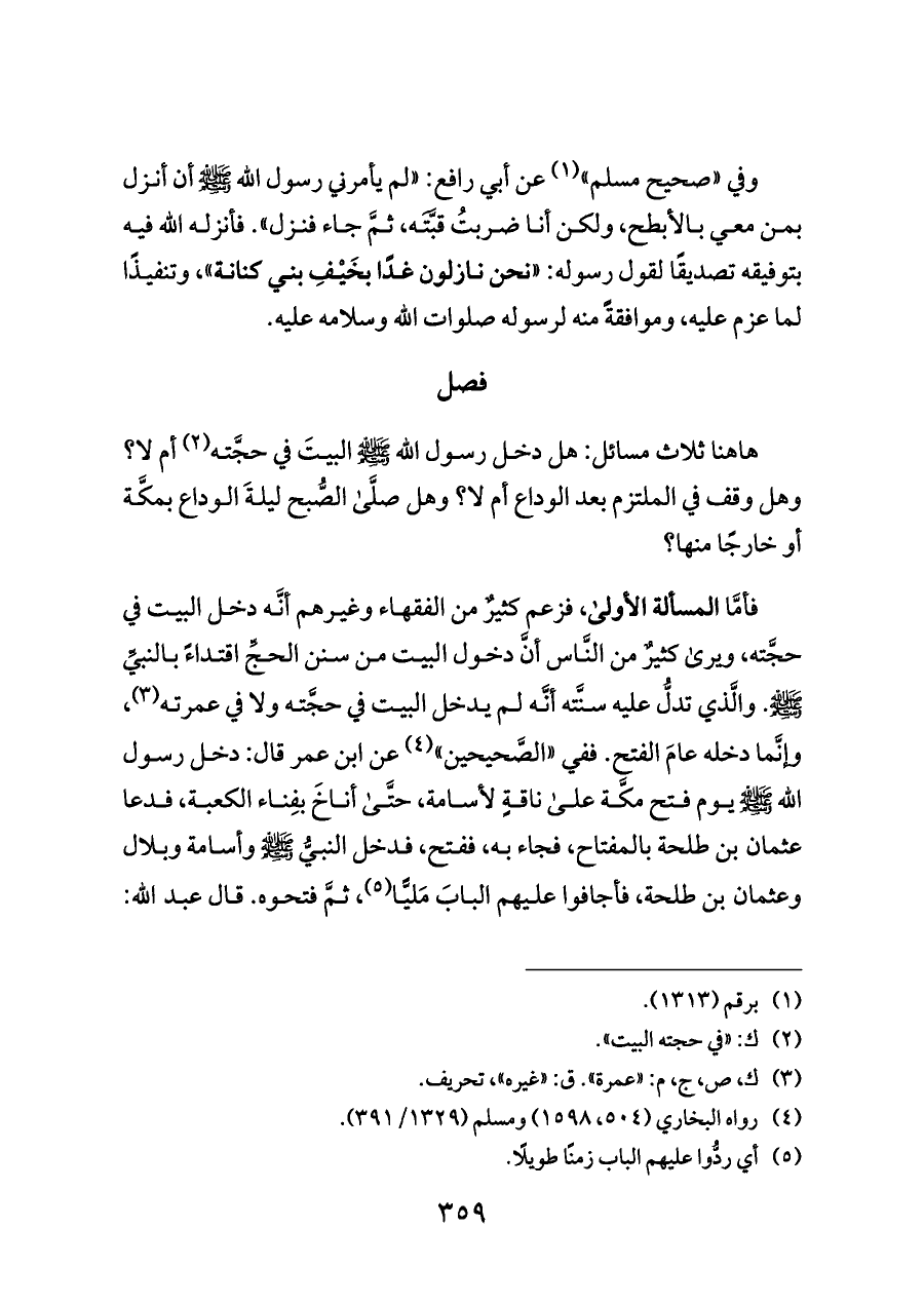 هاهنا ثلاث مسائل: هل دخل رسول الله - صلى الله عليه وسلم - البيتَ في حجَّته (¬٢) أم لا؟ وهل وقف في الملتزم بعد الوداع أم لا؟ وهل صلَّى الصُّبح ليلةَ الوداع بمكَّة أو خارجًا منها؟