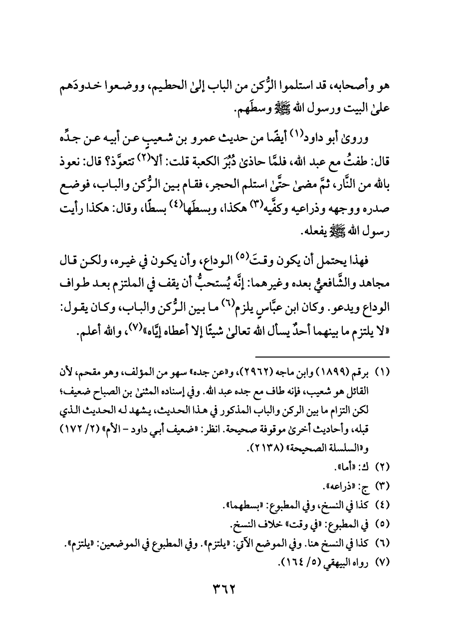 (¬١) برقم (١٨٩٩) وابن ماجه (٢٩٦٢)، و «عن جده» سهو من المؤلف، وهو مقحم، لأن القائل هو شعيب، فإنه طاف مع جده عبد الله. وفي إسناده المثنى بن الصباح ضعيف؛ لكن التزام ما بين الركن والباب المذكور في هذا الحديث، يشهد له الحديث الذي قبله، وأحاديث أخرى موقوفة صحيحة. انظر: «ضعيف أبي داود - الأم» (٢/ ١٧٢) و «السلسلة الصحيحة» (٢١٣٨).