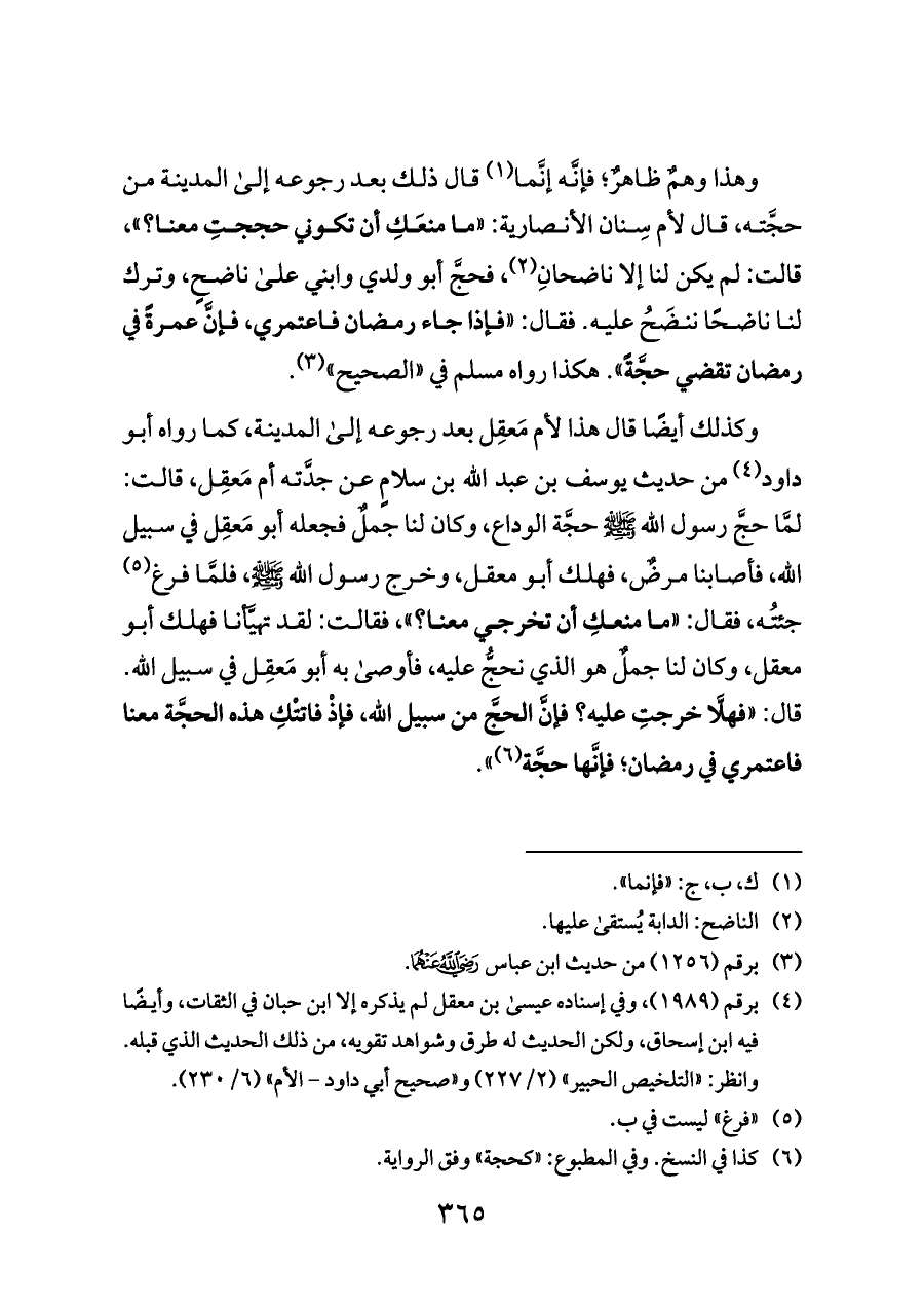 وكذلك أيضًا قال هذا لأم مَعقِل بعد رجوعه إلى المدينة، كما رواه أبو داود (¬٤) من حديث يوسف بن عبد الله بن سلامٍ عن جدَّته أم مَعقِل، قالت: لمَّا حجَّ رسول الله - صلى الله عليه وسلم - حجَّة الوداع، وكان لنا جملٌ فجعله أبو مَعقِل في سبيل اللَّه، فأصابنا مرضٌ، فهلك أبو معقل، وخرج رسول الله - صلى الله عليه وسلم -، فلمَّا فرغ (¬٥) جئتُه، فقال: «ما منعكِ أن تخرجي معنا؟»، فقالت: لقد تهيَّأنا فهلك أبو معقل، وكان لنا جملٌ هو الذي نحجُّ عليه، فأوصى به أبو مَعقِل في سبيل اللَّه. قال: «فهلَّا خرجتِ عليه؟ فإنَّ الحجَّ من سبيل اللَّه، فإذْ فاتتْكِ هذه الحجَّة معنا فاعتمري في رمضان؛ فإنَّها حجَّة (¬٦)».