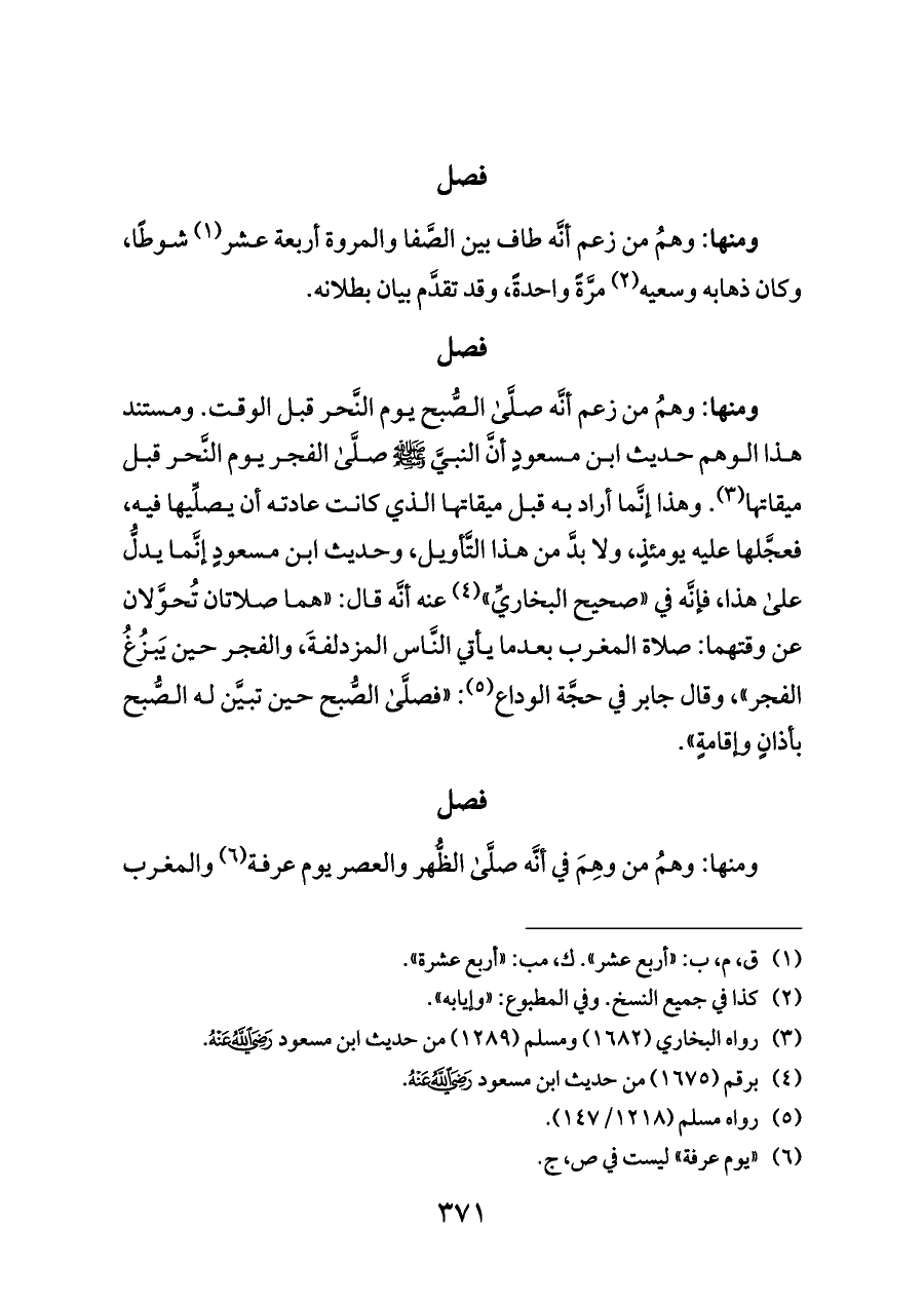 ومنها: وهمُ من زعم أنَّه صلَّى الصُّبح يوم النَّحر قبل الوقت. ومستند هذا الوهم حديث ابن مسعودٍ أنَّ النبيَّ - صلى الله عليه وسلم - صلَّى الفجر يوم النَّحر قبل ميقاتها (¬٣). وهذا إنَّما أراد به قبل ميقاتها الذي كانت عادته أن يصلِّيها فيه، فعجَّلها عليه يومئذٍ، ولا بدَّ من هذا التَّأويل، وحديث ابن مسعودٍ إنَّما يدلُّ على هذا، فإنَّه في «صحيح البخاريِّ» (¬٤) عنه أنَّه قال: «هما صلاتان تُحوَّلان عن وقتهما: صلاة المغرب بعدما يأتي النَّاس المزدلفةَ، والفجر حين يَبزُغُ الفجر»، وقال جابر في حجَّة الوداع (¬٥): «فصلَّى الصُّبح حين تبيَّن له الصُّبح بأذانٍ وإقامةٍ».
