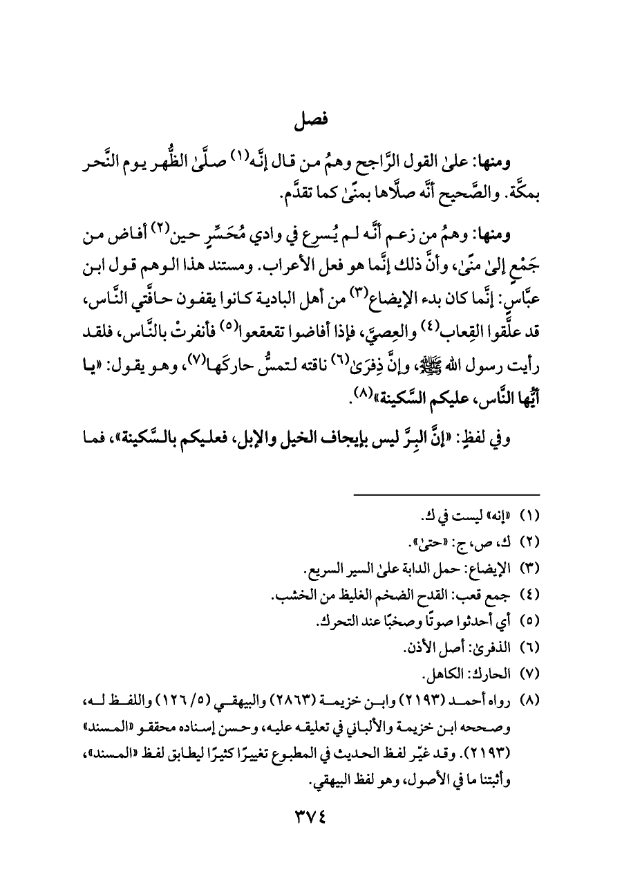 ومنها: وهمُ من زعم أنَّه لم يُسرِع في وادي مُحَسِّرٍ حين (¬٢) أفاض من جَمْعٍ إلى منًى، وأنَّ ذلك إنَّما هو فعل الأعراب. ومستند هذا الوهم قول ابن عبَّاسٍ: إنَّما كان بدء الإيضاع (¬٣) من أهل البادية كانوا يقفون حافَّتي النَّاس، قد علَّقوا القِعاب (¬٤) والعِصيَّ، فإذا أفاضوا تقعقعوا (¬٥) فأنفرتْ بالنَّاس، فلقد رأيت رسول الله - صلى الله عليه وسلم -، وإنَّ ذِفرَى (¬٦) ناقته لتمسُّ حاركَها (¬٧)، وهو يقول: «يا أيُّها النَّاس، عليكم السَّكينة» (¬٨).