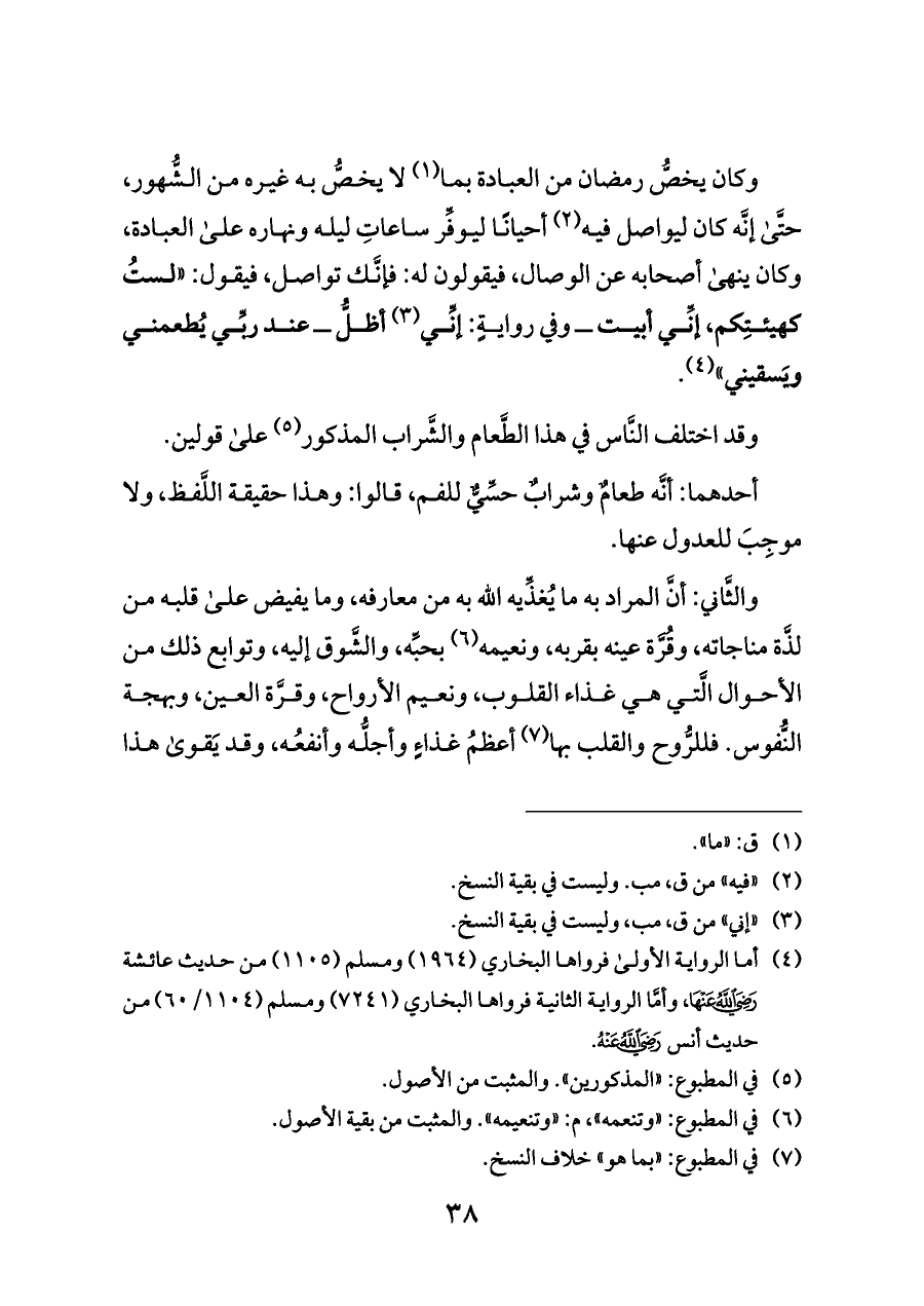 وكان يخصُّ رمضان من العبادة بما (¬١) لا يخصُّ به غيره من الشُّهور، حتَّى إنَّه كان ليواصل فيه (¬٢) أحيانًا ليوفِّر ساعاتِ ليله ونهاره على العبادة، وكان ينهى أصحابه عن الوصال، فيقولون له: فإنَّك تواصل، فيقول: «لستُ كهيئتِكم، إنِّي أبيت ـ وفي روايةٍ: إنِّي (¬٣) أظلُّ ـ عند ربِّي يُطعمني ويَسقيني» (¬٤).