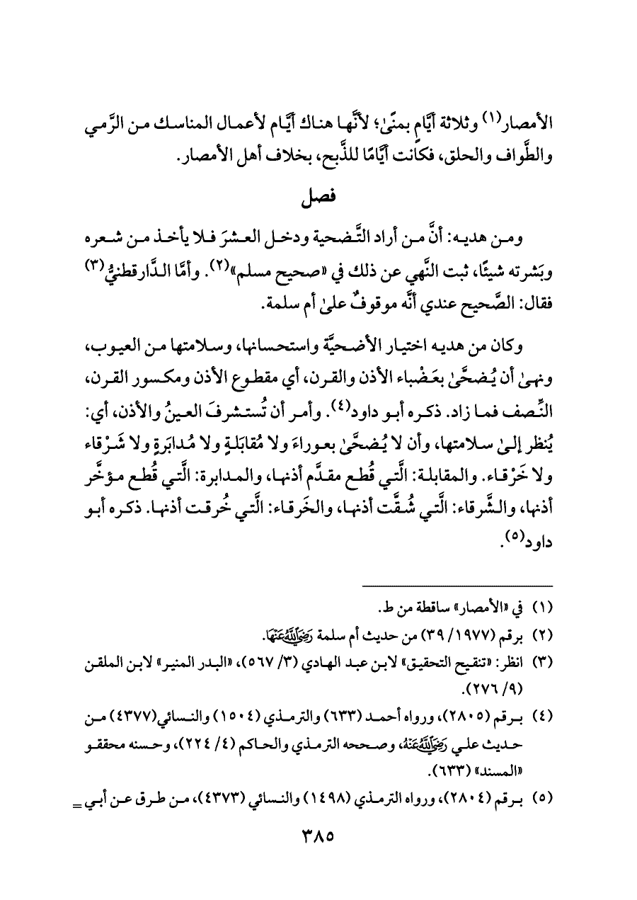 وكان من هديه اختيار الأضحيَّة واستحسانها، وسلامتها من العيوب، ونهى أن يُضحَّى بعَضْباء الأذن والقرن، أي مقطوع الأذن ومكسور القرن، النِّصف فما زاد. ذكره أبو داود (¬٤). وأمر أن تُستشرفَ العينُ والأذن، أي: يُنظر إلى سلامتها، وأن لا يُضحَّى بعوراءَ ولا مُقابَلةٍ ولا مُدابَرةٍ ولا شَرْقاء ولا خَرْقاء. والمقابلة: الَّتي قُطع مقدَّم أذنها، والمدابرة: الَّتي قُطع مؤخَّر أذنها، والشَّرقاء: الَّتي شُقَّت أذنها، والخَرقاء: الَّتي خُرقت أذنها. ذكره أبو داود (¬٥)
