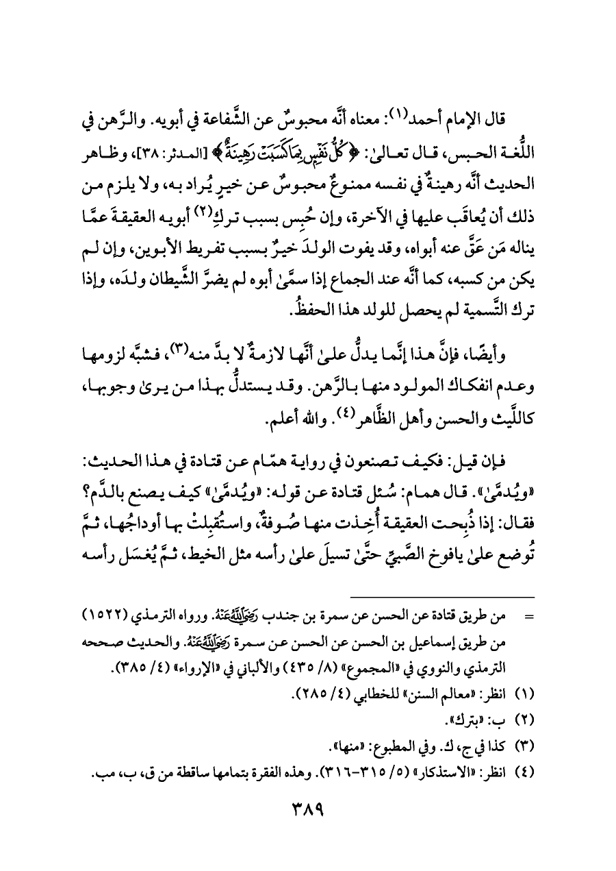 وأيضًا، فإنَّ هذا إنَّما يدلُّ على أنَّها لازمةٌ لا بدَّ منه (¬٣)، فشبَّه لزومها وعدم انفكاك المولود منها بالرَّهن. وقد يستدلُّ بهذا من يرى وجوبها، كاللَّيث والحسن وأهل الظَّاهر (¬٤). والله أعلم.
