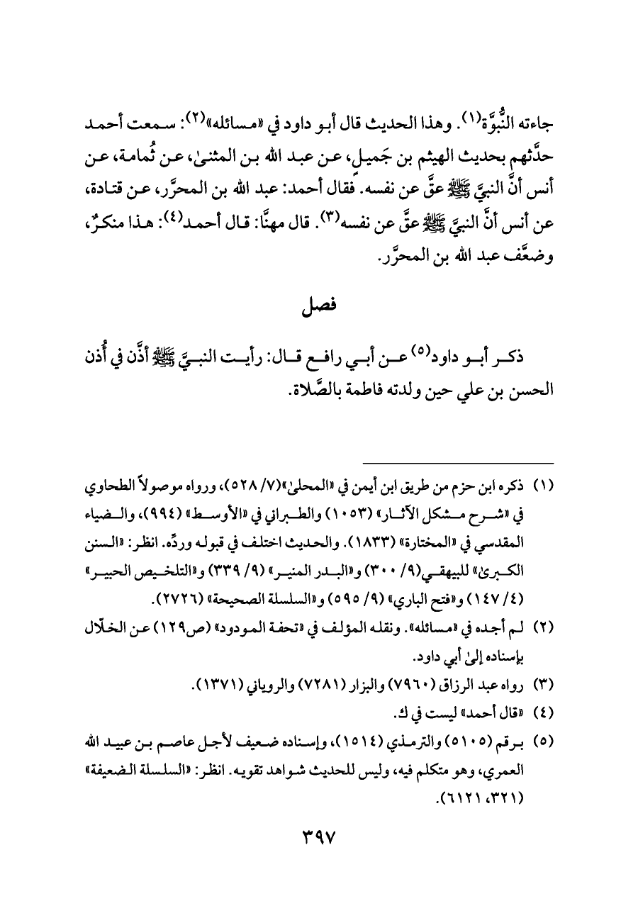 جاءته النُّبوَّة (¬١). وهذا الحديث قال أبو داود في «مسائله» (¬٢): سمعت أحمد حدَّثهم بحديث الهيثم بن جَميلٍ، عن عبد الله بن المثنى، عن ثُمامة، عن أنس أنَّ النبيَّ - صلى الله عليه وسلم - عقَّ عن نفسه. فقال أحمد: عبد الله بن المحرَّر، عن قتادة، عن أنس أنَّ النبيَّ - صلى الله عليه وسلم - عقَّ عن نفسه (¬٣). قال مهنَّا: قال أحمد (¬٤): هذا منكرٌ، وضعَّف عبد الله بن المحرَّر.