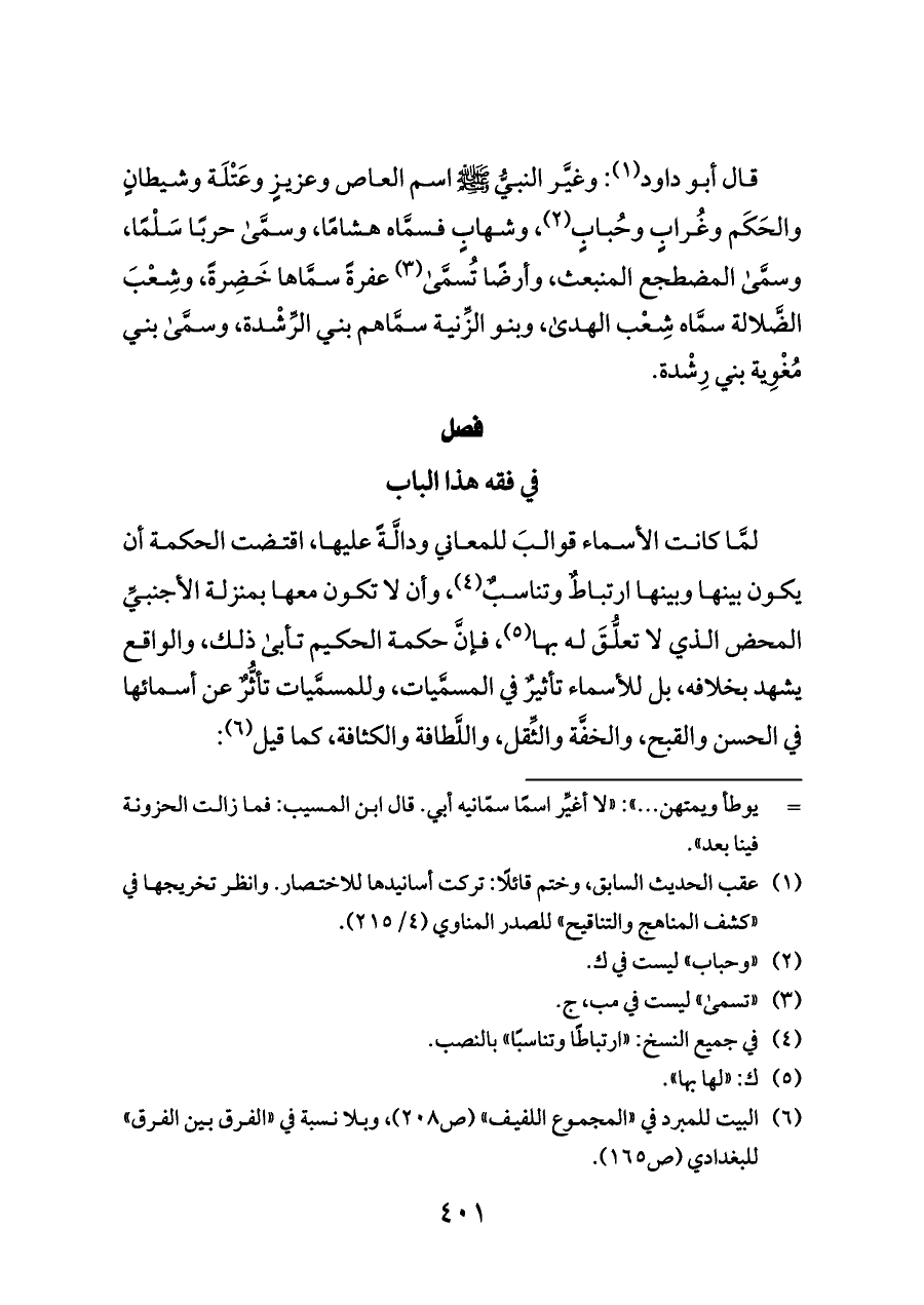 قال أبو داود (¬١): وغيَّر النبيُّ - صلى الله عليه وسلم - اسم العاص وعزيزٍ وعَتْلَة وشيطانٍ والحَكَم وغُرابٍ وحُبابٍ (¬٢)، وشهابٍ فسمَّاه هشامًا، وسمَّى حربًا سَلْمًا، وسمَّى المضطجع المنبعث، وأرضًا تُسمَّى (¬٣) عفرةً سمَّاها خَضِرةً، وشِعْبَ الضَّلالة سمَّاه شِعْب الهدى، وبنو الزِّنية سمَّاهم بني الرِّشْدة، وسمَّى بني مُغْوِية بني رِشْدة.