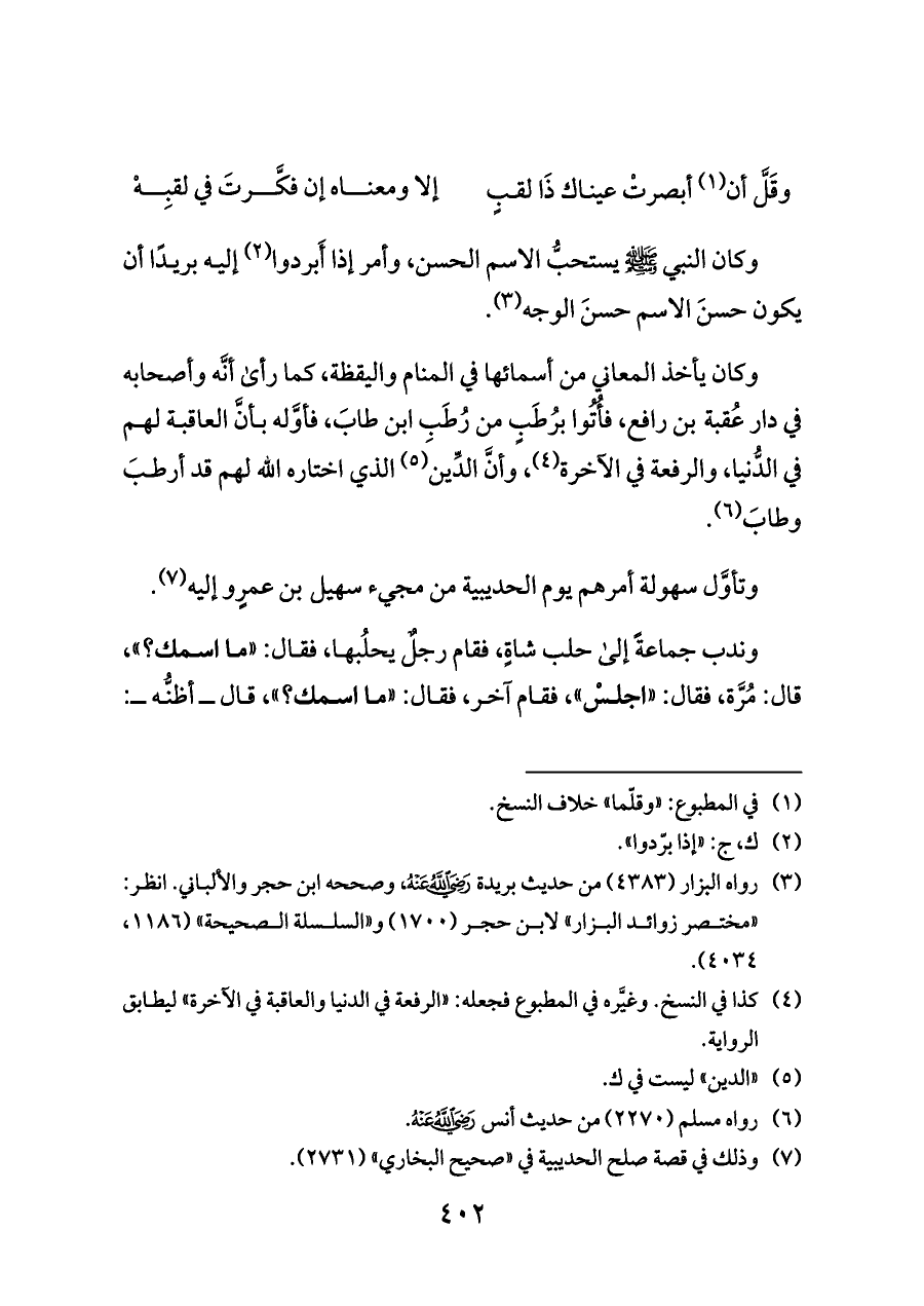 وكان يأخذ المعاني من أسمائها في المنام واليقظة، كما رأى أنَّه وأصحابه في دار عُقبة بن رافع، فأُتُوا برُطَبٍ من رُطَبِ ابن طابَ، فأوَّله بأنَّ العاقبة لهم في الدُّنيا، والرفعة في الآخرة (¬٤)، وأنَّ الدِّين (¬٥) الذي اختاره الله لهم قد أرطبَ وطابَ (¬٦).