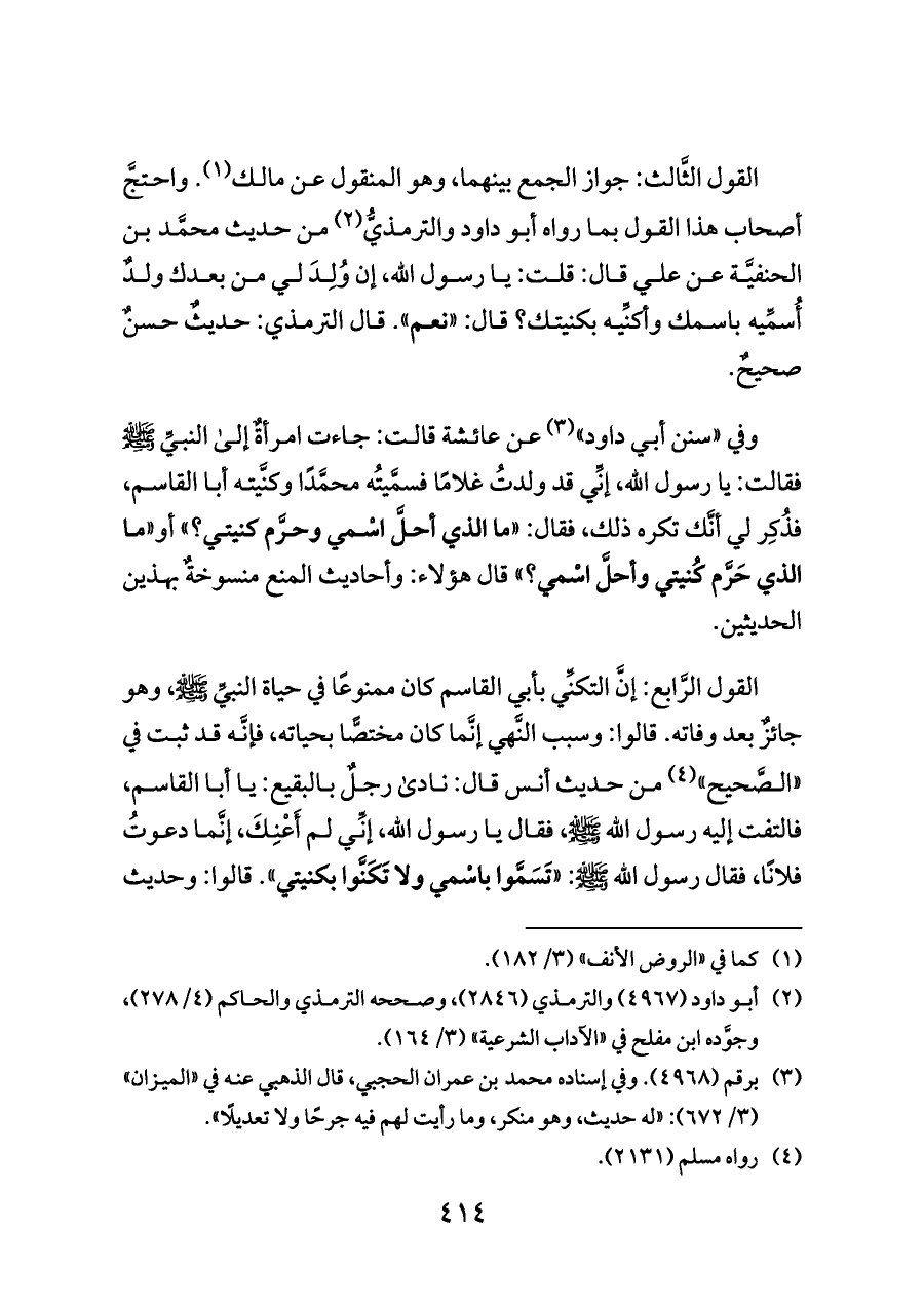 القول الثَّالث: جواز الجمع بينهما، وهو المنقول عن مالك (¬١). واحتجَّ أصحاب هذا القول بما رواه أبو داود والترمذيُّ (¬٢) من حديث محمَّد بن الحنفيَّة عن علي قال: قلت: يا رسول الله، إن وُلِدَ لي من بعدك ولدٌ أُسمِّيه باسمك وأكنِّيه بكنيتك؟ قال: «نعم». قال الترمذي: حديثٌ حسنٌ صحيحٌ.