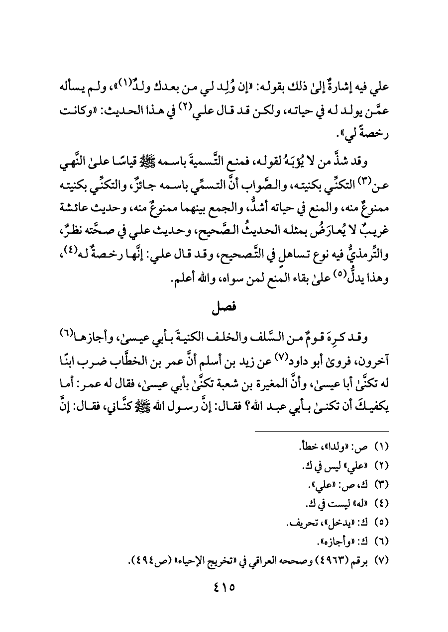 وقد كرِهَ قومٌ من السَّلف والخلف الكنيةَ بأبي عيسى، وأجازها (¬٦) آخرون، فروى أبو داود (¬٧) عن زيد بن أسلم أنَّ عمر بن الخطَّاب ضرب ابنًا له تكنَّى أبا عيسى، وأنَّ المغيرة بن شعبة تكنَّى بأبي عيسى، فقال له عمر: أما يكفيكَ أن تكنى بأبي عبد الله؟ فقال: إنَّ رسول الله - صلى الله عليه وسلم - كنَّاني، فقال: إنَّ