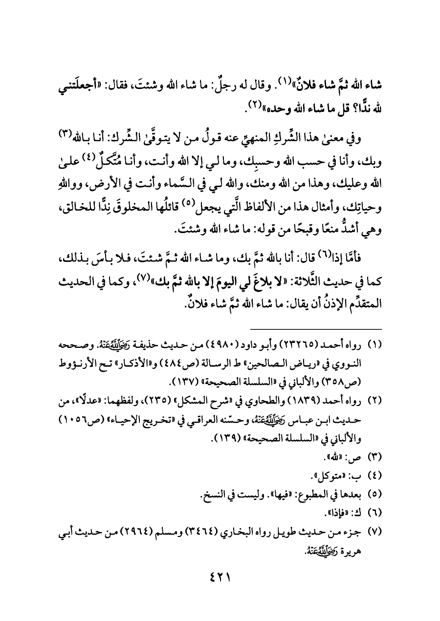 فأمَّا إذا (¬٦) قال: أنا بالله ثمَّ بك، وما شاء الله ثمَّ شئتَ، فلا بأسَ بذلك، كما في حديث الثَّلاثة: «لا بلاغَ لي اليومَ إلا بالله ثمَّ بك» (¬٧)، وكما في الحديث المتقدِّم الإذنُ أن يقال: ما شاء الله ثمَّ شاء فلانٌ.