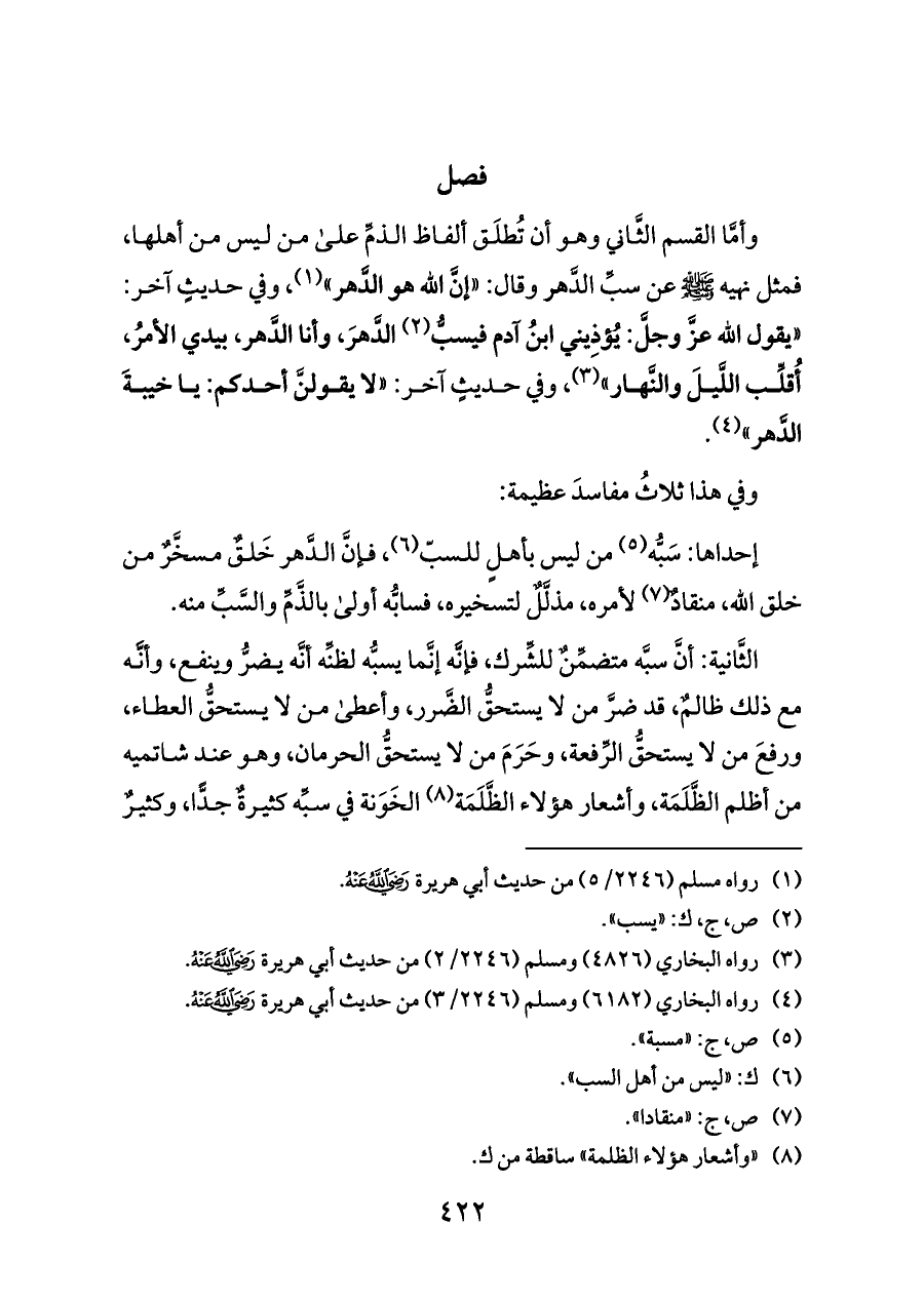 وأمَّا القسم الثَّاني وهو أن تُطلَق ألفاظ الذمِّ على من ليس من أهلها، فمثل نهيه - صلى الله عليه وسلم - عن سبِّ الدَّهر وقال: «إنَّ الله هو الدَّهر» (¬١)، وفي حديثٍ آخر: «يقول الله عزَّ وجلَّ: يُؤذِيني ابنُ آدم فيسبُّ (¬٢) الدَّهرَ، وأنا الدَّهر، بيدي الأمرُ، أُقلِّب اللَّيلَ والنَّهار» (¬٣)، وفي حديثٍ آخر: «لا يقولنَّ أحدكم: يا خيبةَ الدَّهر» (¬٤).