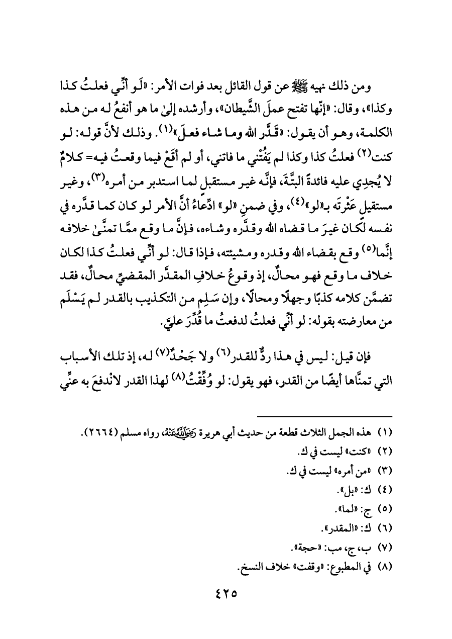 ومن ذلك نهيه - صلى الله عليه وسلم - عن قول القائل بعد فوات الأمر: «لَو أنِّي فعلتُ كذا وكذا»، وقال: «إنّها تفتح عملَ الشَّيطان»، وأرشده إلى ما هو أنفعُ له من هذه الكلمة، وهو أن يقول: «قَدَّر الله وما شاء فعلَ» (¬١). وذلك لأنَّ قوله: لو كنت (¬٢) فعلتُ كذا وكذا لم يَفُتْني ما فاتني، أو لم أقَعْ فيما وقعتُ فيه= كلامٌ لا يُجدِي عليه فائدةً البتَّةَ، فإنَّه غير مستقبلٍ لما استدبر من أمره (¬٣)، وغير مستقيلٍ عَثْرتَه بـ «لو» (¬٤)، وفي ضمنِ «لو» ادِّعاءُ أنَّ الأمر لو كان كما قدَّره في نفسه لكان غيرَ ما قضاه الله وقدَّره وشاءه، فإنَّ ما وقع ممَّا تمنَّى خلافه إنَّما (¬٥) وقع بقضاء الله وقدره ومشيئته، فإذا قال: لو أنِّي فعلتُ كذا لكان خلاف ما وقع فهو محالٌ، إذ وقوعُ خلافِ المقدَّر المقضيِّ محالٌ، فقد تضمَّن كلامه كذبًا وجهلًا ومحالًا، وإن سَلِم من التكذيب بالقدر لم يَسْلَم من معارضته بقوله: لو أنِّي فعلتُ لدفعتُ ما قُدِّرَ عليَّ.