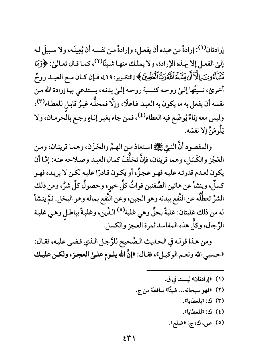 ومن هذا قوله في الحديث الصَّحيح للرَّجل الذي قضى عليه، فقال: «حسبي الله ونعم الوكيل»، فقال: «إنَّ الله يلوم على العجز، ولكن عليك