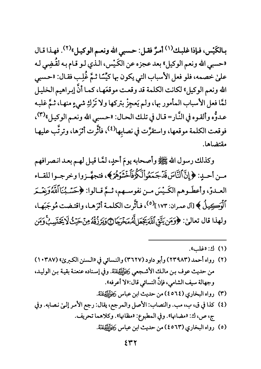 بالكَيْس، فإذا غلبك (¬١) أمرٌ فقل: حسبي الله ونعم الوكيل» (¬٢). فهذا قال «حسبي الله ونعم الوكيل» بعد عجزه عن الكَيْس، الذي لو قام به لقُضِي له على خصمه، فلو فعل الأسباب التي يكون بها كيِّسًا ثمَّ غُلِب فقال: «حسبي الله ونعم الوكيل» لكانت الكلمة قد وقعت موقعَها، كما أنَّ إبراهيم الخليل لمَّا فعل الأسباب المأمور بها، ولم يَعجِزْ بتركها ولا تَرْكِ شيءٍ منها، ثمَّ غلبه عدوُّه وألقوه في النَّار= قال في تلك الحال: «حسبي الله ونعم الوكيل» (¬٣)، فوقعت الكلمة موقعها، واستقرَّت في نصابِها (¬٤)، فأثَّرت أثرَها، وترتَّب عليها مقتضاها.