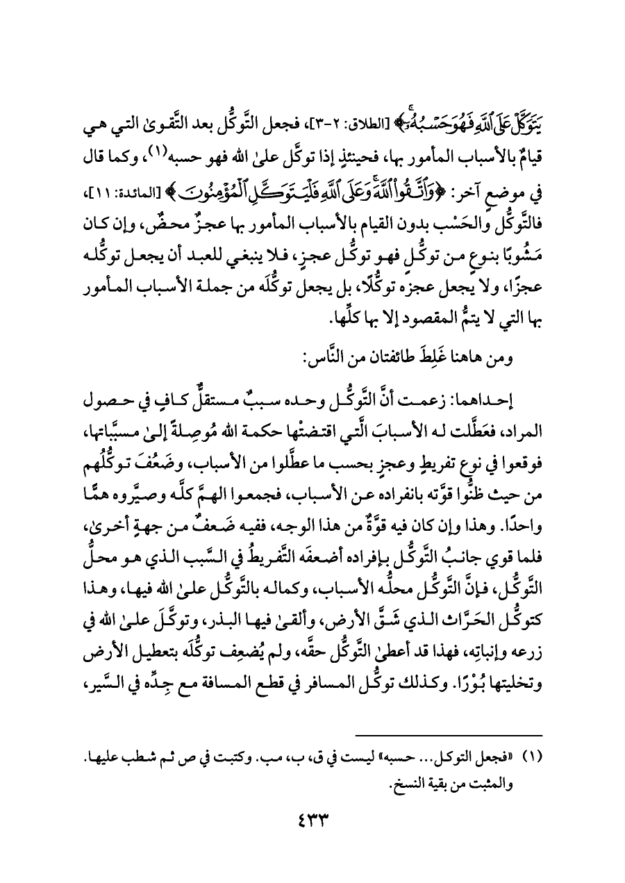 إحداهما: زعمت أنَّ التَّوكُّل وحده سببٌ مستقلٌّ كافٍ في حصول المراد، فعَطَّلت له الأسبابَ الَّتي اقتضتْها حكمة الله مُوصِلةً إلى مسبَّباتها، فوقعوا في نوع تفريطٍ وعجزٍ بحسب ما عطَّلوا من الأسباب، وضَعُفَ توكُّلُهم من حيث ظنُّوا قوَّته بانفراده عن الأسباب، فجمعوا الهمَّ كلَّه وصيَّروه همًّا واحدًا. وهذا وإن كان فيه قوَّةٌ من هذا الوجه، ففيه ضَعفٌ من جهةٍ أخرى، فلما قوي جانبُ التَّوكُّل بإفراده أضعفَه التَّفريطُ في السَّبب الذي هو محلُّ التَّوكُّل، فإنَّ التَّوكُّل محلُّه الأسباب، وكماله بالتَّوكُّل على الله فيها، وهذا كتوكُّل الحَرَّاث الذي شَقَّ الأرض، وألقى فيها البذر، وتوكَّلَ على الله في زرعه وإنباتِه، فهذا قد أعطى التَّوكُّل حقَّه، ولم يُضعِف توكُّلَه بتعطيل الأرض وتخليتها بُوْرًا. وكذلك توكُّل المسافر في قطع المسافة مع جِدِّه في السَّير،