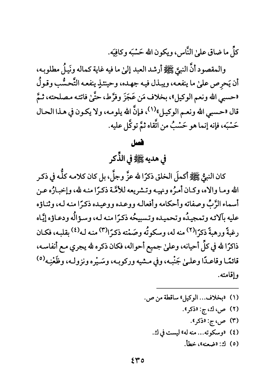 كان النبيُّ - صلى الله عليه وسلم - أكملَ الخلق ذكرًا لله عزَّ وجلَّ، بل كان كلامه كلُّه في ذكر الله وما والاه، وكان أمرُه ونهيه وتشريعه للأمَّة ذكرًا منه للَّه، وإخبارُه عن أسماء الرَّبِّ وصفاته وأحكامه وأفعاله ووعده ووعيده ذكرًا منه له، وثناؤه عليه بآلائه وتمجيدُه وتحميده وتسبيحُه ذكرًا منه له، وسؤالُه ودعاؤه إيَّاه رغبةً ورهبةً ذكرًا (¬٢) منه له، وسكوتُه وصَمْته ذكرًا (¬٣) منه له (¬٤) بقلبه، فكان ذاكرًا لله في كلِّ أحيانه، وعلى جميع أحواله، فكان ذكره لله يجري مع أنفاسه، قائمًا وقاعدًا وعلى جَنْبه، وفي مشيه وركوبه، وسَيْره ونزوله، وظَعْنِه (¬٥) وإقامته.