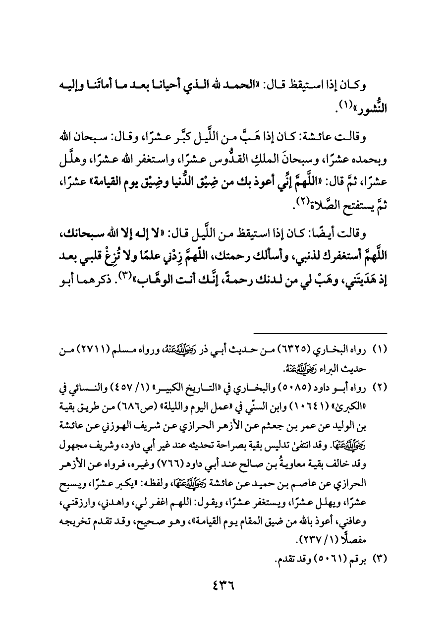 وقالت أيضًا: كان إذا استيقظ من اللَّيل قال: «لا إله إلا الله سبحانك، اللَّهمَّ أستغفرك لذنبي، وأسألك رحمتك، اللّهمَّ زِدْني علمًا ولا تُزِغْ قلبي بعد إذ هَدَيتَني، وهَبْ لي من لدنك رحمةً، إنَّك أنت الوهَّاب» (¬٣). ذكرهما أبو