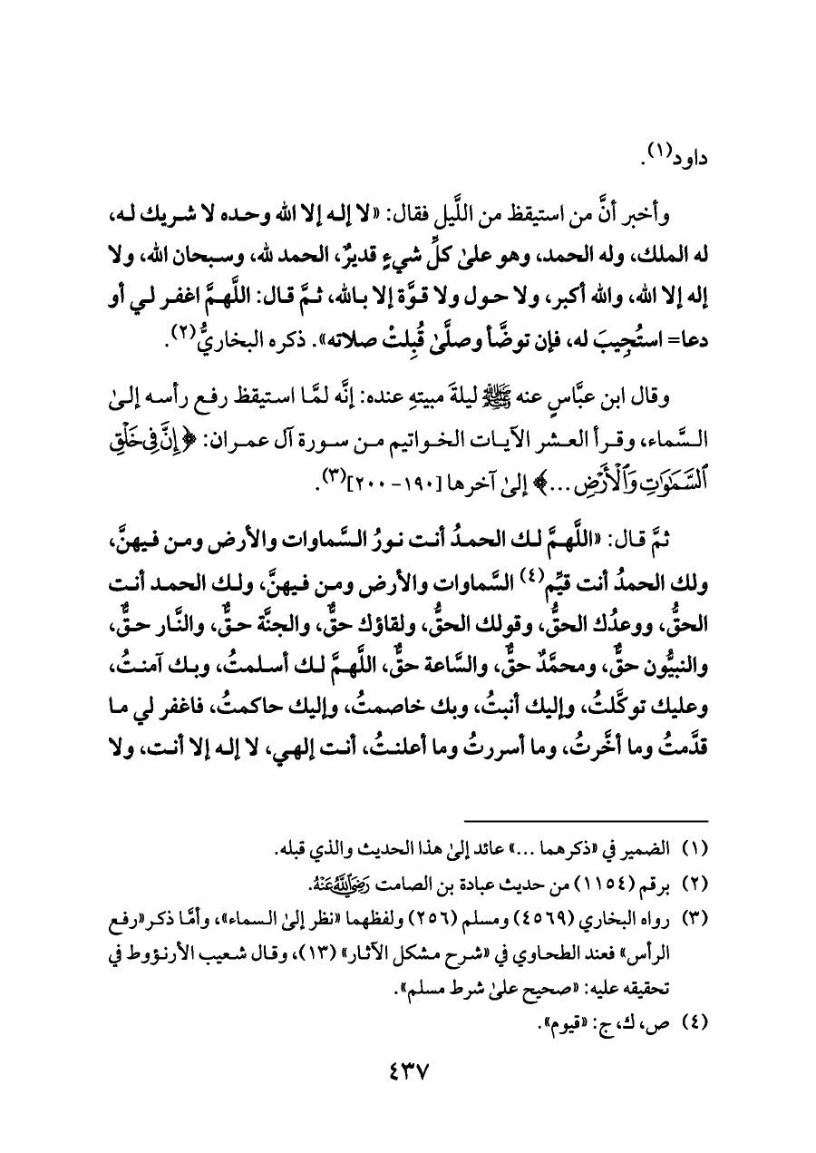 ثمَّ قال: «اللَّهمَّ لك الحمدُ أنت نورُ السَّماوات والأرض ومن فيهنَّ، ولك الحمدُ أنت قيِّم (¬٤) السَّماوات والأرض ومن فيهنَّ، ولك الحمد أنت الحقُّ، ووعدُك الحقُّ، وقولك الحقُّ، ولقاؤك حقٌّ، والجنَّة حقٌّ، والنَّار حقٌّ، والنبيُّون حقٌّ، ومحمَّدٌ حقٌّ، والسَّاعة حقٌّ، اللَّهمَّ لك أسلمتُ، وبك آمنتُ، وعليك توكَّلتُ، وإليك أنبتُ، وبك خاصمتُ، وإليك حاكمتُ، فاغفر لي ما قدَّمتُ وما أخَّرتُ، وما أسررتُ وما أعلنتُ، أنت إلهي، لا إله إلا أنت، ولا
