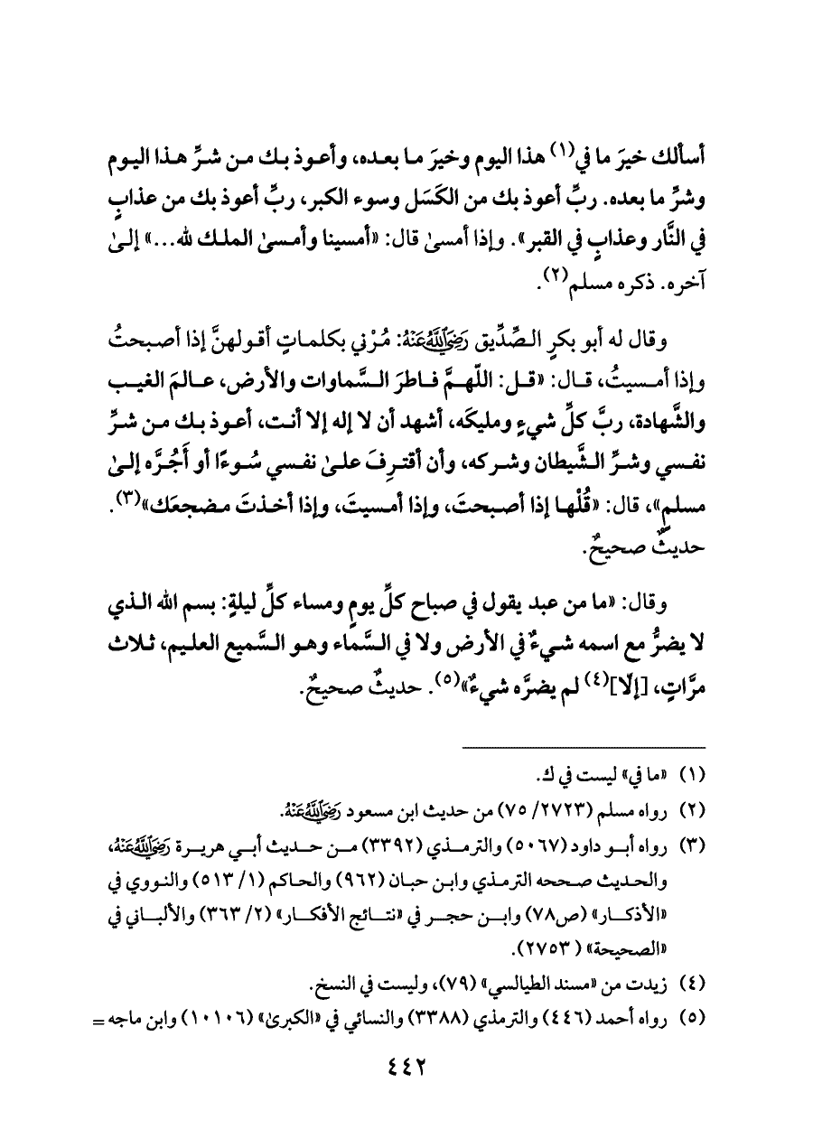 وقال له أبو بكرٍ الصِّدِّيق - رضي الله عنه -: مُرْني بكلماتٍ أقولهنَّ إذا أصبحتُ وإذا أمسيتُ، قال: «قل: اللّهمَّ فاطرَ السَّماوات والأرض، عالمَ الغيب والشَّهادة، ربَّ كلِّ شيءٍ ومليكَه، أشهد أن لا إله إلا أنت، أعوذ بك من شرِّ نفسي وشرِّ الشَّيطان وشركه، وأن أقترِفَ على نفسي سُوءًا أو أَجُرَّه إلى مسلمٍ»، قال: «قُلْها إذا أصبحتَ, وإذا أمسيتَ، وإذا أخذتَ مضجعَك» (¬٣). حديثٌ صحيحٌ.