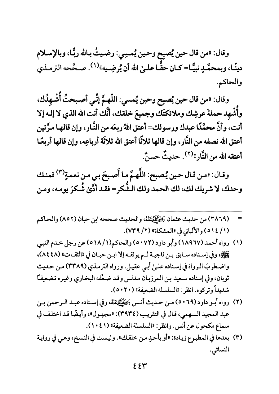 وقال: «من قال حين يُصبِح وحين يُمسِي: رضيتُ بالله ربًّا، وبالإسلام دينًا، وبمحمَّدٍ نبيًّا= كان حقًّا على الله أن يُرضِيه» (¬١). صحَّحه الترمذي والحاكم.