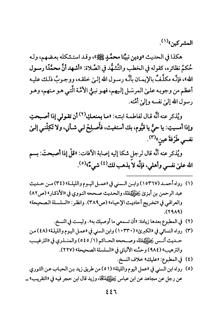 ويُذكر عنه أنَّه قال لفاطمة ابنته: «ما يمنعكِ (¬٢) أن تقولي إذا أصبحتِ وإذا أمسيتِ: يا حيُّ يا قيُّوم، بك أستغيث، فأَصلِحْ لي شأني، ولا تَكِلْني إلى نفسي طَرْفةَ عينٍ» (¬٣).