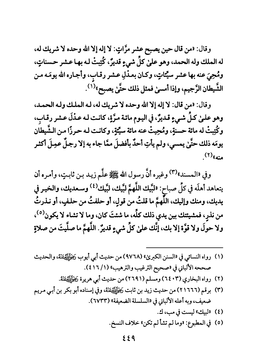 وفي «المسند» (¬٣) وغيره أنَّ رسول الله - صلى الله عليه وسلم - علَّم زيد بن ثابتٍ، وأمره أن يتعاهد أهلَه في كلِّ صباحٍ: «لبَّيك اللَّهمَّ لبَّيك، لبَّيك (¬٤) وسعديك، والخير في يديك، ومنك وإليك، اللَّهمَّ ما قلتُ من قولٍ، أو حلفتُ من حلفٍ، أو نذرتُ من نذرٍ، فمشيئتك بين يدي ذلك كلِّه، ما شئتَ كان، وما لا تشاء لا يكون (¬٥)، ولا حولَ ولا قوَّة إلا بك، إنَّك على كلِّ شيءٍ قديرٌ. اللَّهمَّ ما صلَّيتَ من صلاةٍ