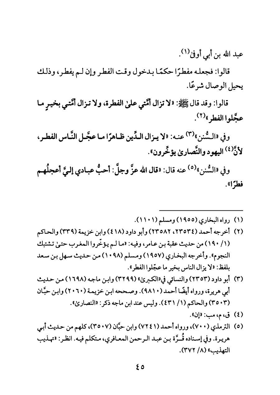 (¬٢) أخرجه أحمد (٢٣٥٣٤، ٢٣٥٨٢) وأبو داود (٤١٨) وابن خزيمة (٣٣٩) والحاكم (١/ ١٩٠) من حديث عقبة بن عامر، وفيه: «ما لم يؤخّروا المغرب حتى تشتبك النجوم». وأخرجه البخاري (١٩٥٧) ومسلم (١٠٩٨) من حديث سهل بن سعد بلفظ: «لا يزال الناس بخير ما عجّلوا الفطر».