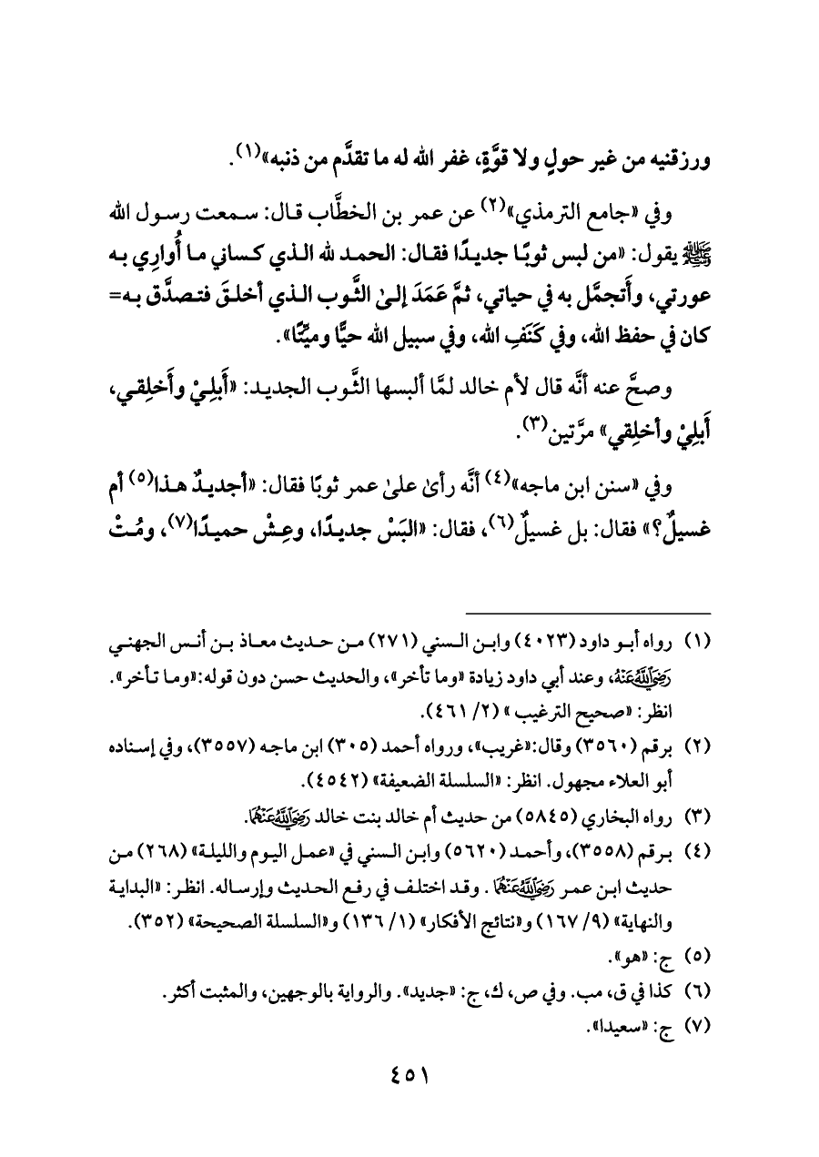 وفي «جامع الترمذي» (¬٢) عن عمر بن الخطَّاب قال: سمعت رسول الله - صلى الله عليه وسلم - يقول: «من لبس ثوبًا جديدًا فقال: الحمد لله الذي كساني ما أُوارِي به عورتي، وأَتجمَّل به في حياتي، ثمَّ عَمَدَ إلى الثَّوب الذي أخلقَ فتصدَّق به= كان في حفظ اللَّه، وفي كَنَفِ اللَّه، وفي سبيل الله حيًّا وميِّتًا».