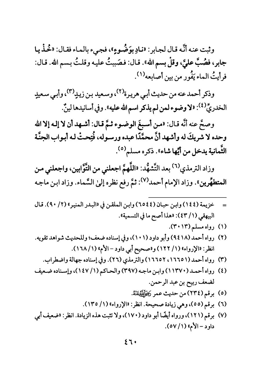 وذكر أحمد عنه من حديث أبي هريرة (¬٢)، وسعيد بن زيدٍ (¬٣)، وأبي سعيدٍ الخدريِّ (¬٤): «لا وضوء لمن لم يذكر اسم الله عليه». وفي أسانيدها لينٌ.