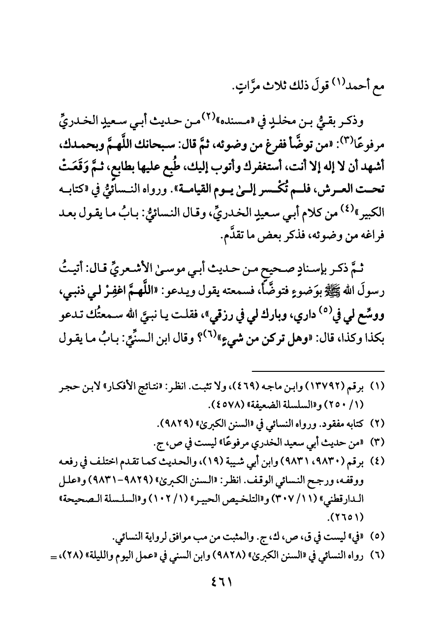 وذكر بقيُّ بن مخلدٍ في «مسنده» (¬٢) من حديث أبي سعيدٍ الخدريِّ مرفوعًا (¬٣): «من توضَّأ ففرغ من وضوئه، ثمَّ قال: سبحانك اللَّهمَّ وبحمدك، أشهد أن لا إله إلا أنت، أستغفرك وأتوب إليك، طُبِع عليها بطابعٍ، ثمَّ وَقَعَتْ تحت العرش، فلم تُكْسر إلى يوم القيامة». ورواه النسائيُّ في «كتابه الكبير» (¬٤) من كلام أبي سعيدٍ الخدريِّ، وقال النسائيُّ: بابُ ما يقول بعد فراغه من وضوئه، فذكر بعض ما تقدَّم.