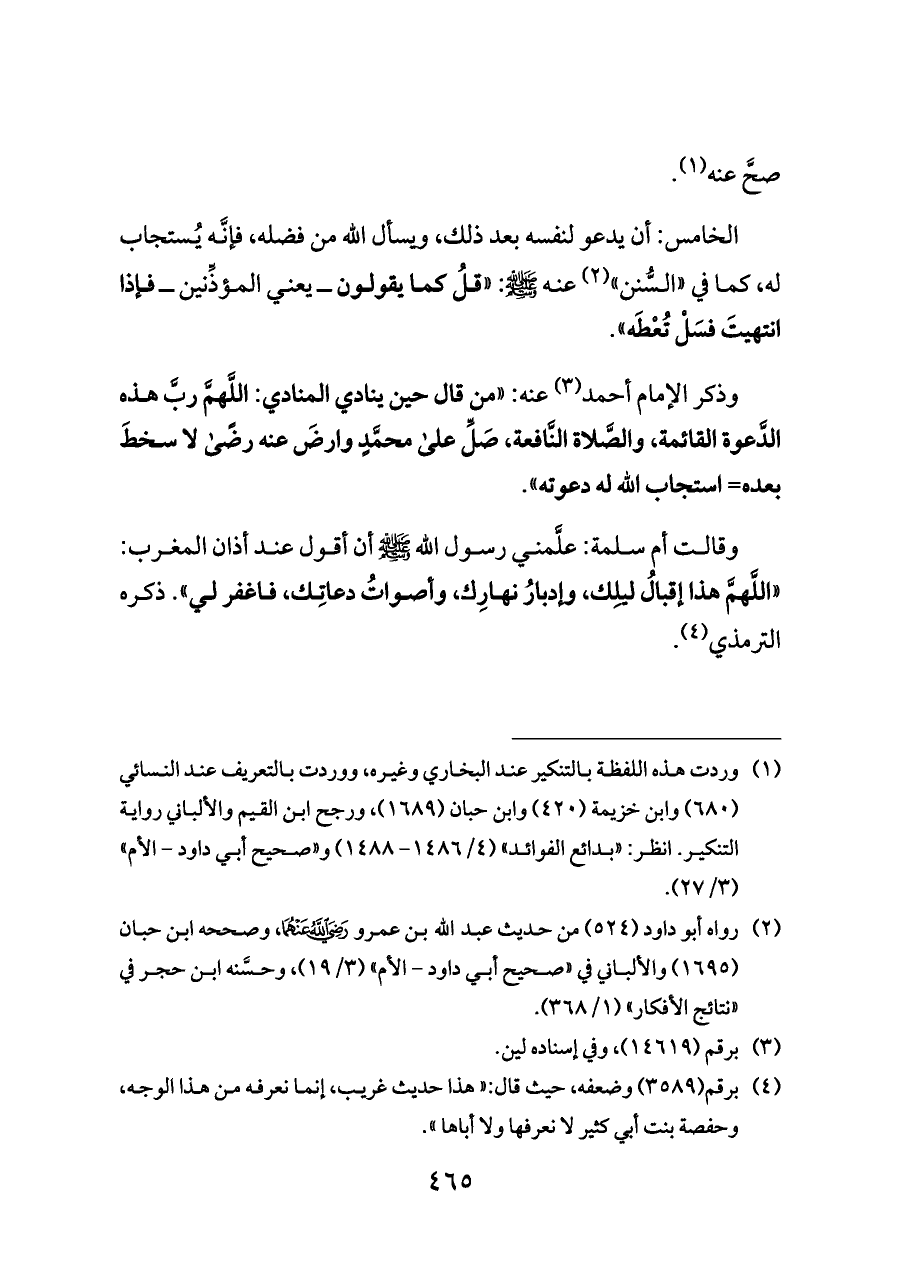 وقالت أم سلمة: علَّمني رسول الله - صلى الله عليه وسلم - أن أقول عند أذان المغرب: «اللَّهمَّ هذا إقبالُ ليلِك، وإدبارُ نهارِك، وأصواتُ دعاتِك، فاغفر لي». ذكره الترمذي (¬٤).
