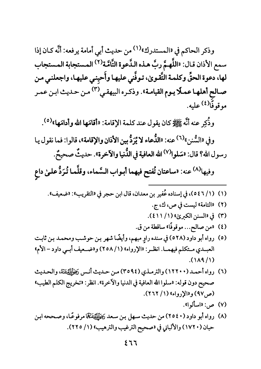 وفي «السُّنن» (¬٦) عنه: «الدُّعاء لا يُرَدُّ بين الأذان والإقامة»، قالوا: فما نقول يا رسول اللَّه؟ قال: «سَلوا (¬٧) الله العافية في الدُّنيا والآخرة». حديثٌ صحيحٌ.