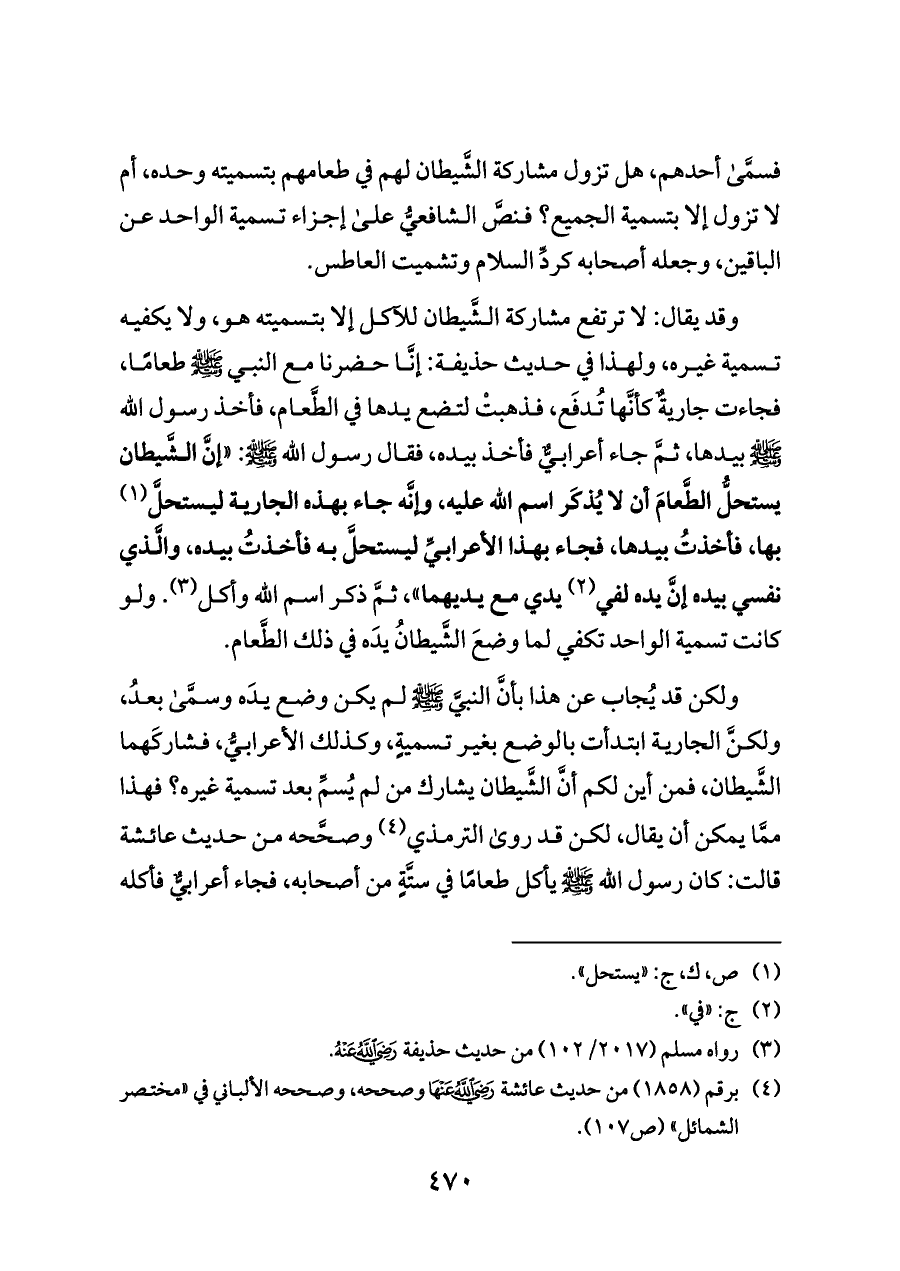 ولكن قد يُجاب عن هذا بأنَّ النبيَّ - صلى الله عليه وسلم - لم يكن وضع يدَه وسمَّى بعدُ، ولكنَّ الجارية ابتدأت بالوضع بغير تسميةٍ، وكذلك الأعرابيُّ، فشاركَهما الشَّيطان، فمن أين لكم أنَّ الشَّيطان يشارك من لم يُسمِّ بعد تسمية غيره؟ فهذا ممَّا يمكن أن يقال، لكن قد روى الترمذي (¬٤) وصحَّحه من حديث عائشة قالت: كان رسول الله - صلى الله عليه وسلم - يأكل طعامًا في ستَّةٍ من أصحابه، فجاء أعرابيٌّ فأكله