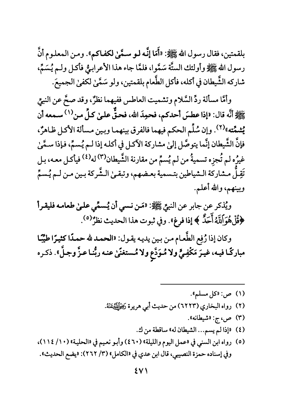 وأمَّا مسألة ردِّ السَّلام وتشميت العاطس ففيهما نظرٌ، وقد صحَّ عن النبيِّ - صلى الله عليه وسلم - أنَّه قال: «إذا عطسَ أحدكم، فحمِدَ اللَّه، فحقٌّ على كلِّ من (¬١) سمعه أن يُشمِّته» (¬٢). وإن سُلِّم الحكم فيهما فالفرق بينهما وبين مسألة الأكل ظاهرٌ، فإنَّ الشَّيطان إنَّما يتوصَّل إلى مشاركة الآكل في أكله إذا لم يُسمِّ، فإذا سمَّى غيرُه لم تُجزِه تسميةُ من لم يُسمِّ من مقارنة الشَّيطان (¬٣) له (¬٤) فيأكل معه، بل تَقِلُّ مشاركة الشياطين بتسمية بعضهم، وتبقى الشَّركة بين من لم يُسمِّ وبينهم، والله أعلم.