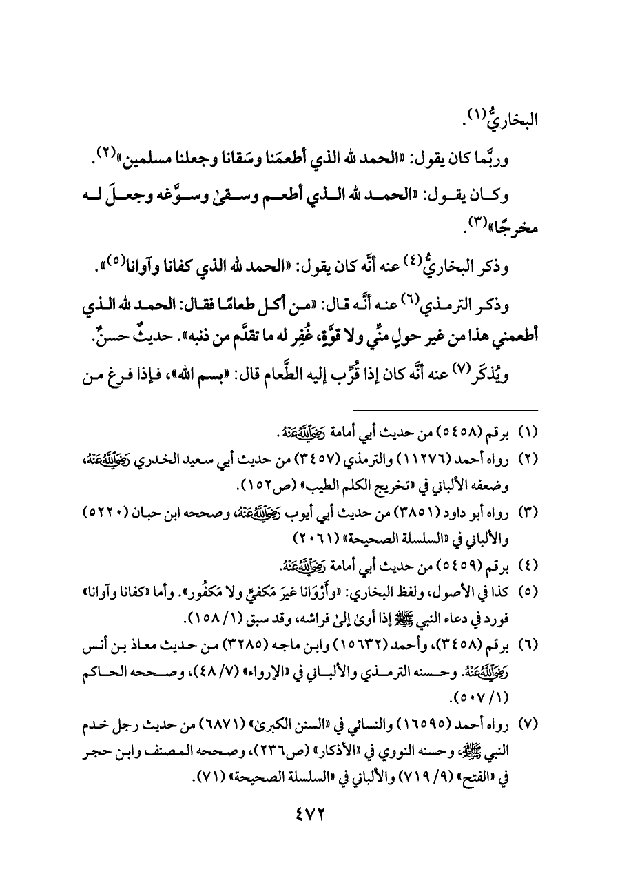 (¬٥) كذا في الأصول، ولفظ البخاري: «وأَرْوَانا غيرَ مَكفيٍّ ولا مَكفُور». وأما «كفانا وآوانا» فورد في دعاء النبي - صلى الله عليه وسلم - إذا أوى إلى فراشه، وقد سبق (١/ ١٥٨).