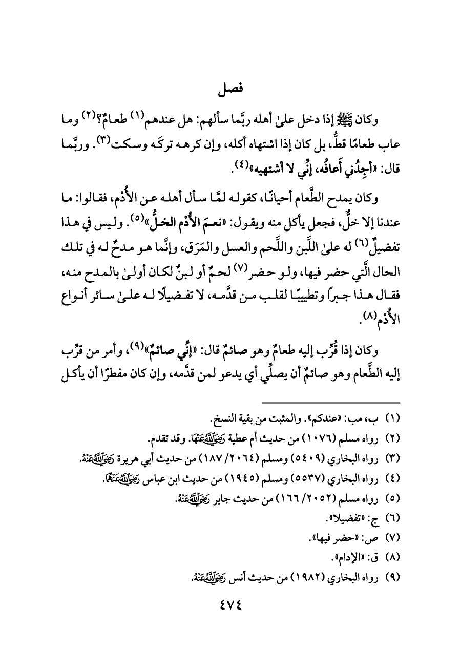 وكان يمدح الطَّعام أحيانًا، كقوله لمَّا سأل أهله عن الأُدْم، فقالوا: ما عندنا إلا خلٌّ، فجعل يأكل منه ويقول: «نعمَ الأُدْم الخلُّ» (¬٥). وليس في هذا تفضيلٌ (¬٦) له على اللَّبن واللَّحم والعسل والمَرَق، وإنَّما هو مدحٌ له في تلك الحال الَّتي حضر فيها، ولو حضر (¬٧) لحمٌ أو لبنٌ لكان أولى بالمدح منه، فقال هذا جبرًا وتطييبًا لقلب من قدَّمه، لا تفضيلًا له على سائر أنواع الأُدْم (¬٨).