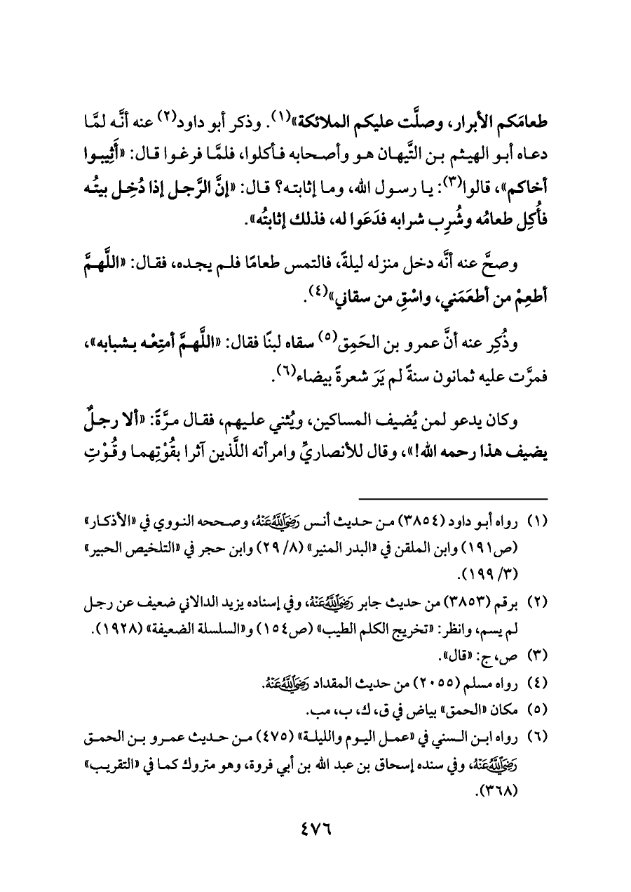 وصحَّ عنه أنَّه دخل منزله ليلةً، فالتمس طعامًا فلم يجده، فقال: «اللَّهمَّ أطعِمْ من أطعَمَني، واسْقِ من سقاني» (¬٤).