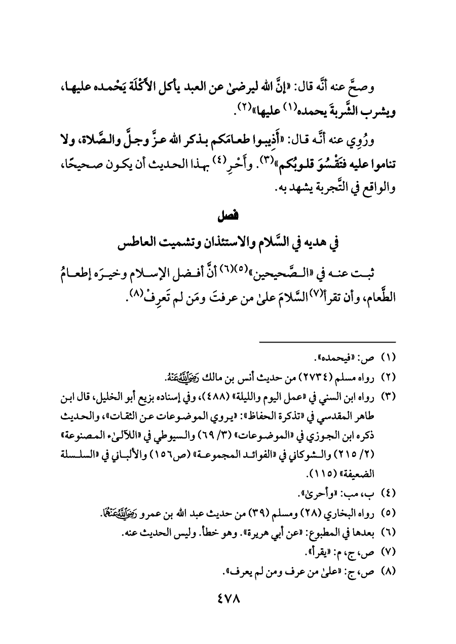 وصحَّ عنه أنَّه قال: «إنَّ الله ليرضى عن العبد يأكل الأَكْلَة يَحْمده عليها، ويشرب الشَّربةَ يحمده (¬١) عليها» (¬٢).