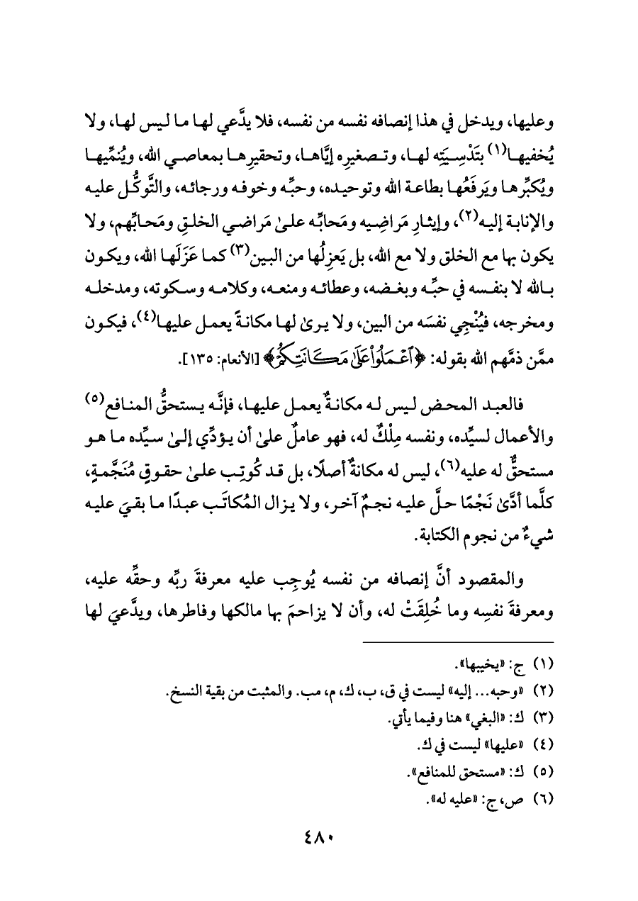 وعليها، ويدخل في هذا إنصافه نفسه من نفسه، فلا يدَّعي لها ما ليس لها، ولا يُخفيها (¬١) بتَدْسِيَتِه لها، وتصغيرِه إيَّاها، وتحقيرِها بمعاصي الله، ويُنمِّيها ويُكبِّرها ويَرفَعُها بطاعة الله وتوحيده، وحبِّه وخوفه ورجائه، والتَّوكُّل عليه والإنابة إليه (¬٢)، وإيثارِ مَراضِيه ومَحابِّه على مَراضي الخلقِ ومَحابِّهم، ولا يكون بها مع الخلق ولا مع الله، بل يَعزِلُها من البين (¬٣) كما عَزَلَها اللَّه، ويكون بالله لا بنفسه في حبِّه وبغضه، وعطائه ومنعه، وكلامه وسكوته، ومدخله ومخرجه، فيُنْجِي نفسَه من البين، ولا يرى لها مكانةً يعمل عليها (¬٤)، فيكون ممَّن ذمَّهم الله بقوله: {اعْمَلُوا عَلَى مَكَانَتِكُمْ} [الأنعام: ١٣٥].