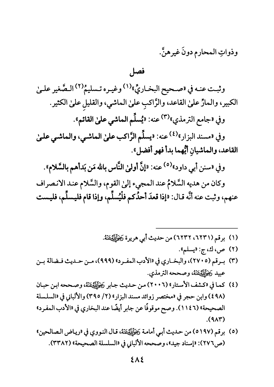وثبت عنه في «صحيح البخاريِّ» (¬١) وغيره تسليمُ (¬٢) الصَّغير على الكبير، والمارِّ على القاعد، والرَّاكبِ على الماشي، والقليلِ على الكثير.
