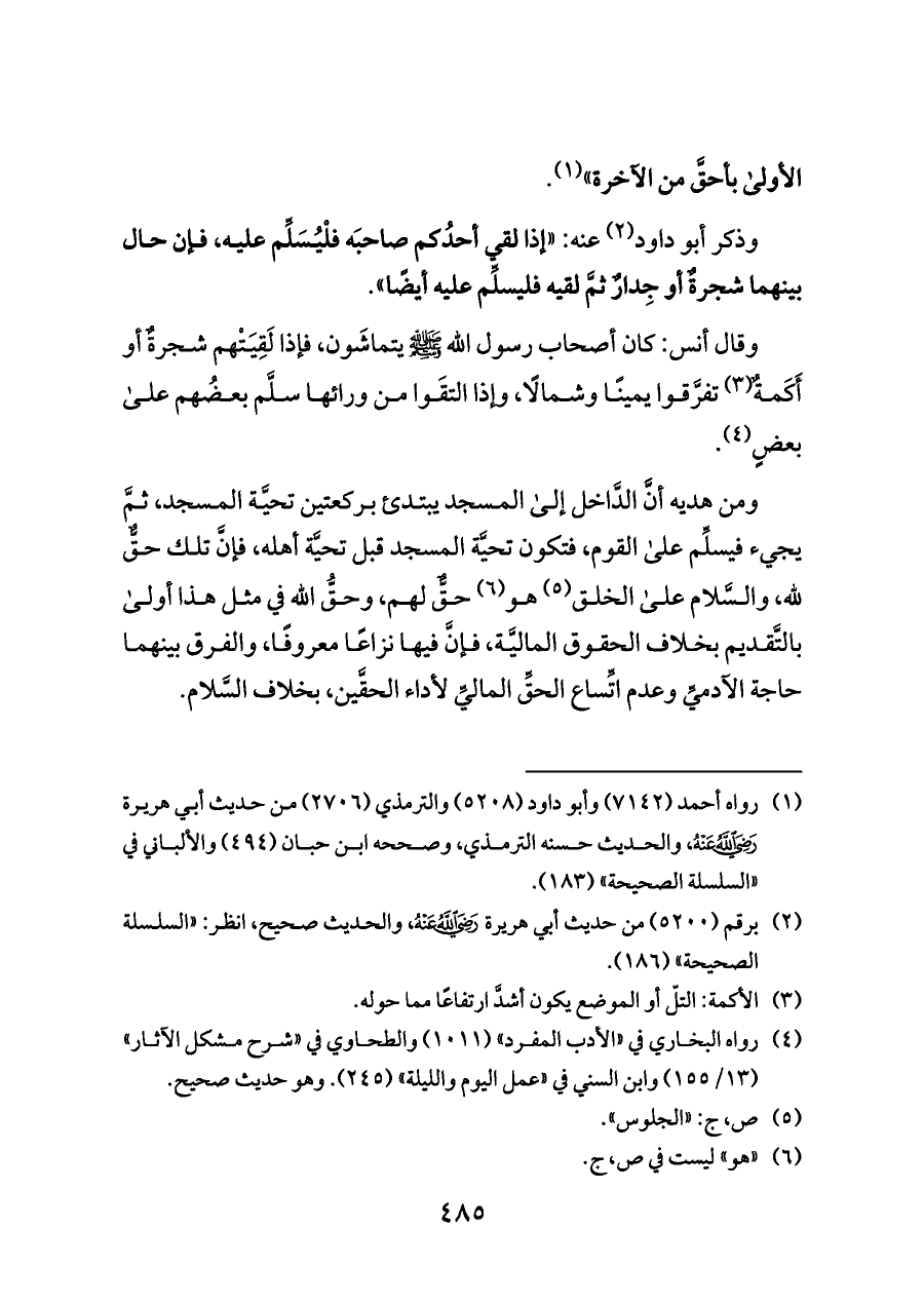 وذكر أبو داود (¬٢) عنه: «إذا لقي أحدُكم صاحبَه فلْيُسَلِّم عليه، فإن حال بينهما شجرةٌ أو جِدارٌ ثمَّ لقيه فليسلِّم عليه أيضًا».