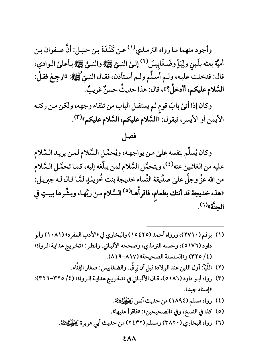 وأجود منهما ما رواه الترمذي (¬١) عن كَلَدَةَ بن حنبل: أنَّ صفوان بن أميَّة بعثه بلَبنٍ ولِبَأٍ وضَغَابِيسَ (¬٢) إلى النبيِّ - صلى الله عليه وسلم - والنبيُّ - صلى الله عليه وسلم - بأعلى الوادي، قال: فدخلت عليه، ولم أسلِّم ولم أستأذن، فقال النبيُّ - صلى الله عليه وسلم -: «ارجِعْ فقلْ: السَّلام عليكم، أأدخلُ؟»، قال: هذا حديثٌ حسنٌ غريبٌ.