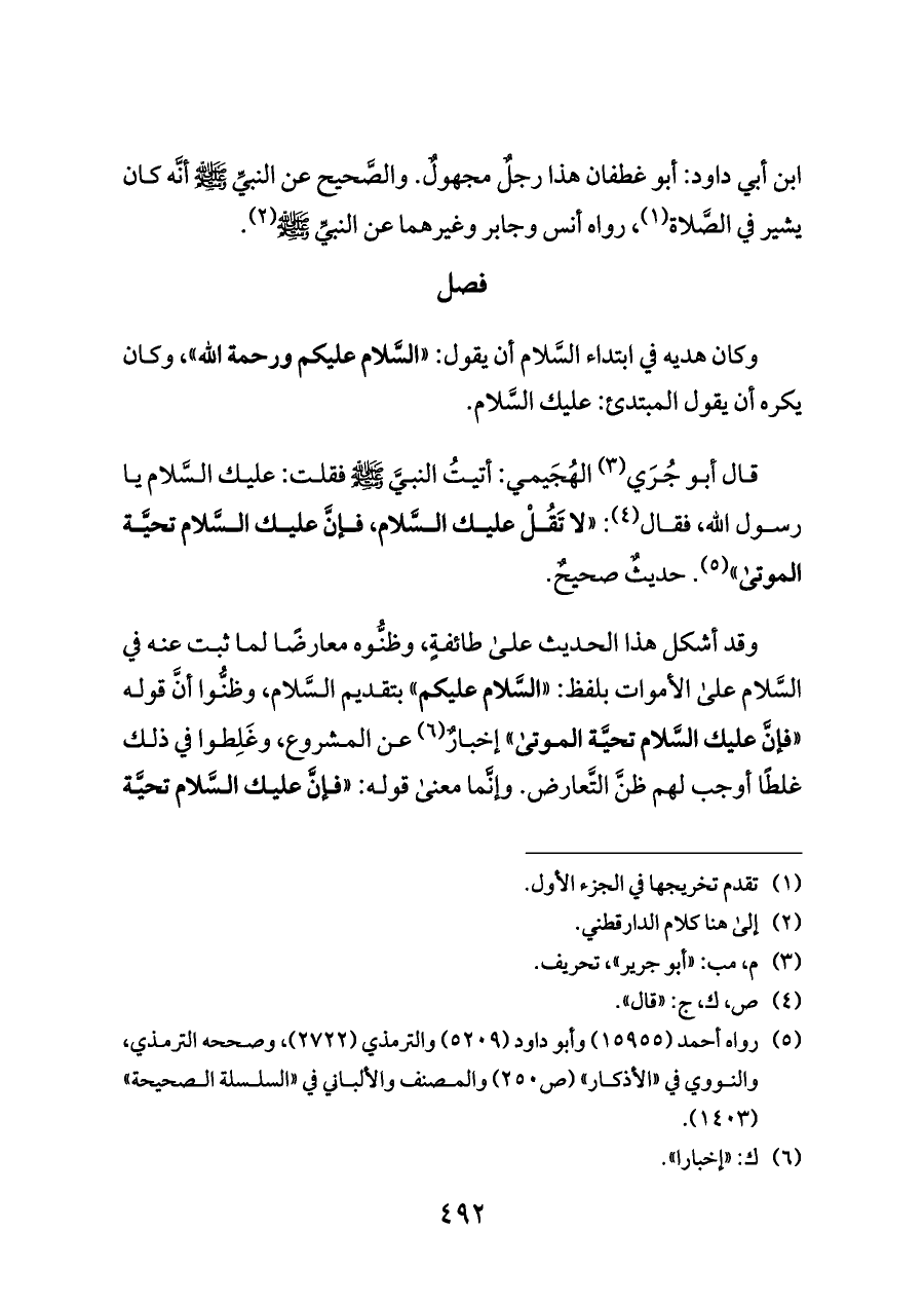 قال أبو جُرَي (¬٣) الهُجَيمي: أتيتُ النبيَّ - صلى الله عليه وسلم - فقلت: عليك السَّلام يا رسول اللَّه، فقال (¬٤): «لا تَقُلْ عليك السَّلام، فإنَّ عليك السَّلام تحيَّة الموتى» (¬٥). حديثٌ صحيحٌ.