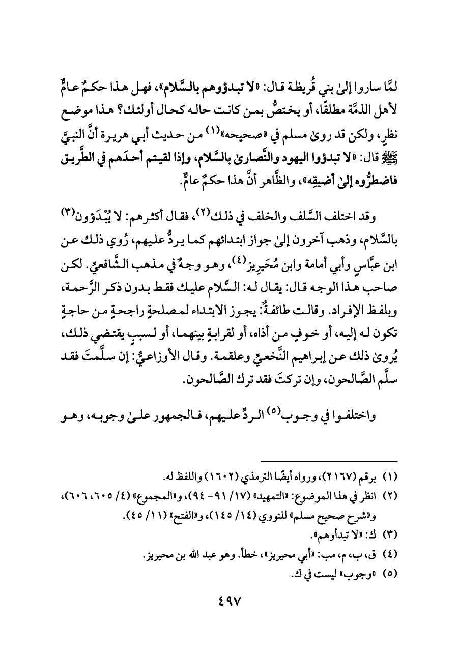 لمَّا ساروا إلى بني قُريظة قال: «لا تبدؤوهم بالسَّلام»، فهل هذا حكمٌ عامٌّ لأهل الذمَّة مطلقًا، أو يختصُّ بمن كانت حاله كحال أولئك؟ هذا موضع نظرٍ، ولكن قد روى مسلم في «صحيحه» (¬١) من حديث أبي هريرة أنَّ النبيَّ - صلى الله عليه وسلم - قال: «لا تبدؤوا اليهود والنَّصارى بالسَّلام، وإذا لقيتم أحدَهم في الطَّريق فاضطرُّوه إلى أضيقِه»، والظَّاهر أنَّ هذا حكمٌ عامٌّ.