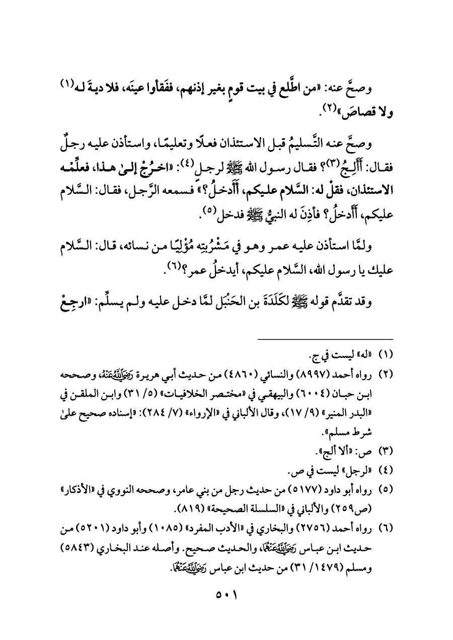 وصحَّ عنه التَّسليمُ قبل الاستئذان فعلًا وتعليمًا، واستأذن عليه رجلٌ فقال: أَأَلِجُ (¬٣)؟ فقال رسول الله - صلى الله عليه وسلم - لرجلٍ (¬٤): «اخرُجْ إلى هذا، فعلِّمْه الاستئذان، فقلْ له: السَّلام عليكم، أَأَدخلُ؟» فسمعه الرَّجل، فقال: السَّلام عليكم، أَأَدخلُ؟ فأذِنَ له النبيُّ - صلى الله عليه وسلم - فدخل (¬٥).