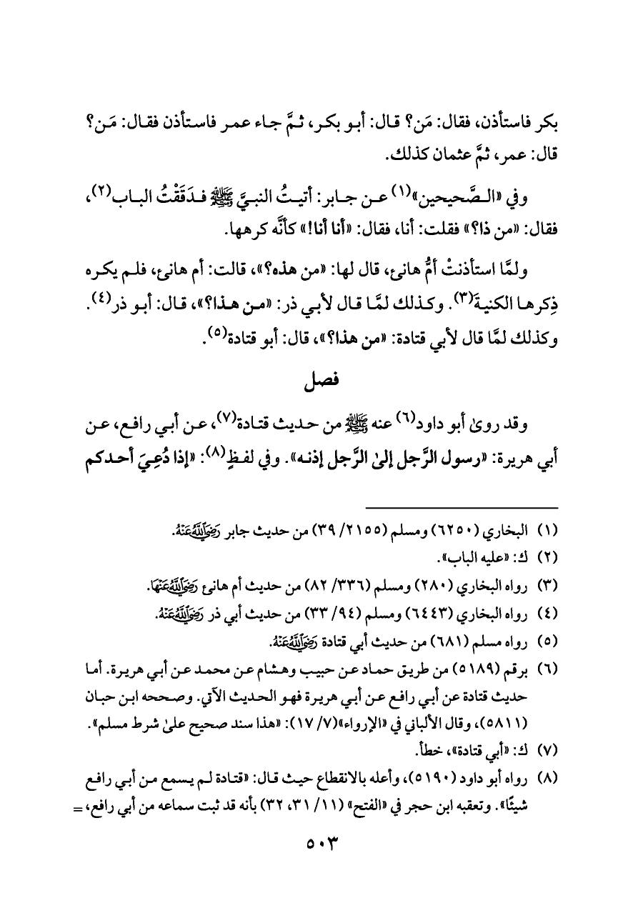 ولمَّا استأذنتْ أمُّ هانئ، قال لها: «من هذه؟»، قالت: أم هانئ، فلم يكره ذِكرها الكنيةَ (¬٣). وكذلك لمَّا قال لأبي ذر: «من هذا؟»، قال: أبو ذر (¬٤). وكذلك لمَّا قال لأبي قتادة: «من هذا؟»، قال: أبو قتادة (¬٥).