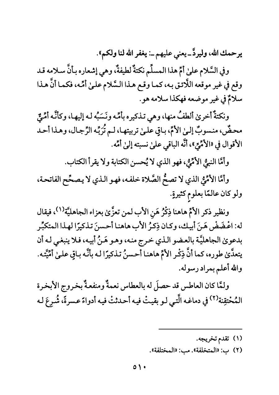 وفي السَّلام على أمِّ هذا المسلِّم نكتةٌ لطيفةٌ، وهي إشعاره بأنَّ سلامه قد وقع في غير موقعه اللَّائق به، كما وقع هذا السَّلام على أمِّه، فكما أنَّ هذا سلامٌ في غير موضعه فهكذا سلامه هو.